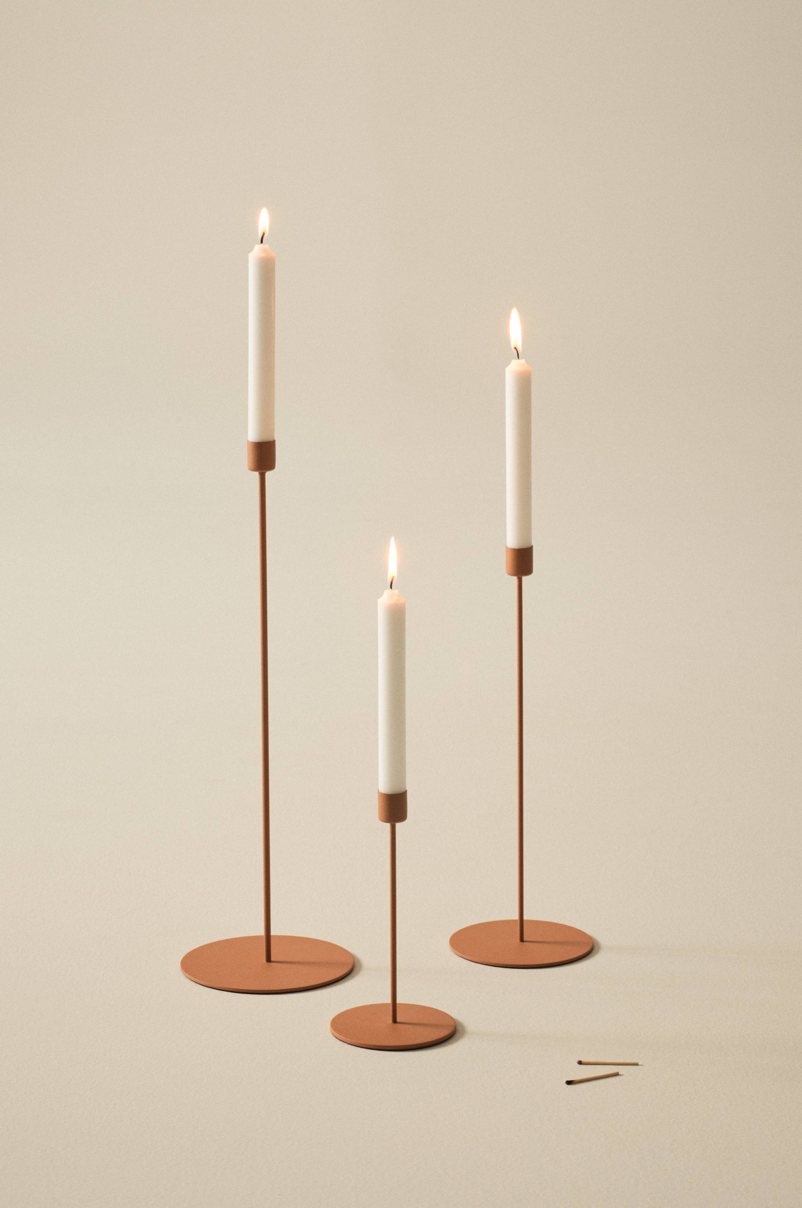 Een set van drie smalle kandelaars van gepoedercoat ijzer. Perfect voor iedere dag en een feest.