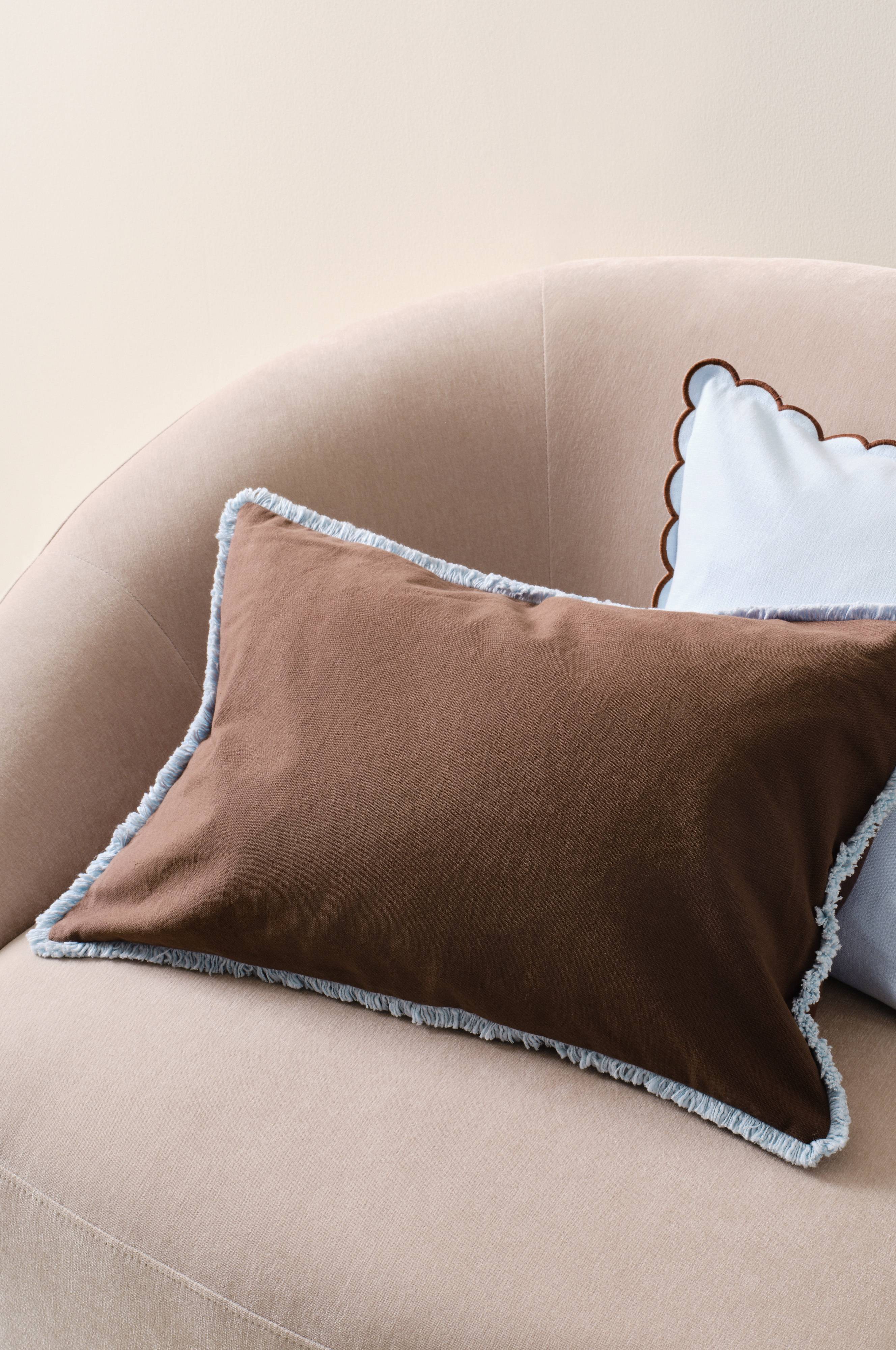Kussenhoes EMMA is gemaakt van effen geverfd, gewassen katoen. Deze hoes voelt zacht aan en heeft fijne franjes langs de randen, waardoor hij een leuke flair aan je kamer geeft. Rits aan de onderkant.