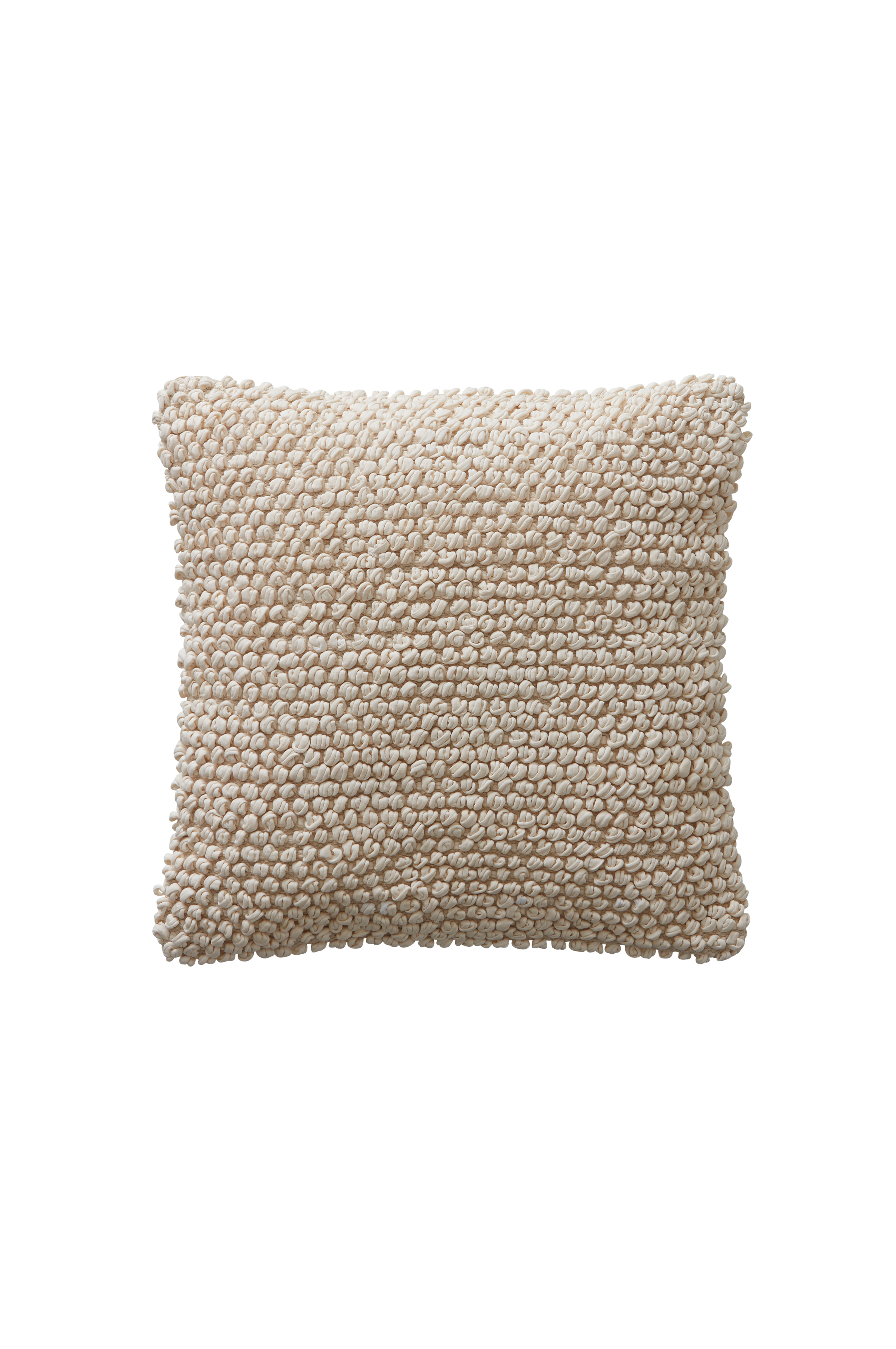 Een kussenhoes van zachte katoenmix in een neutrale kleur met een popcornstructuur van lusjes. De kussenhoes heeft een ritssluiting aan de onderkant.