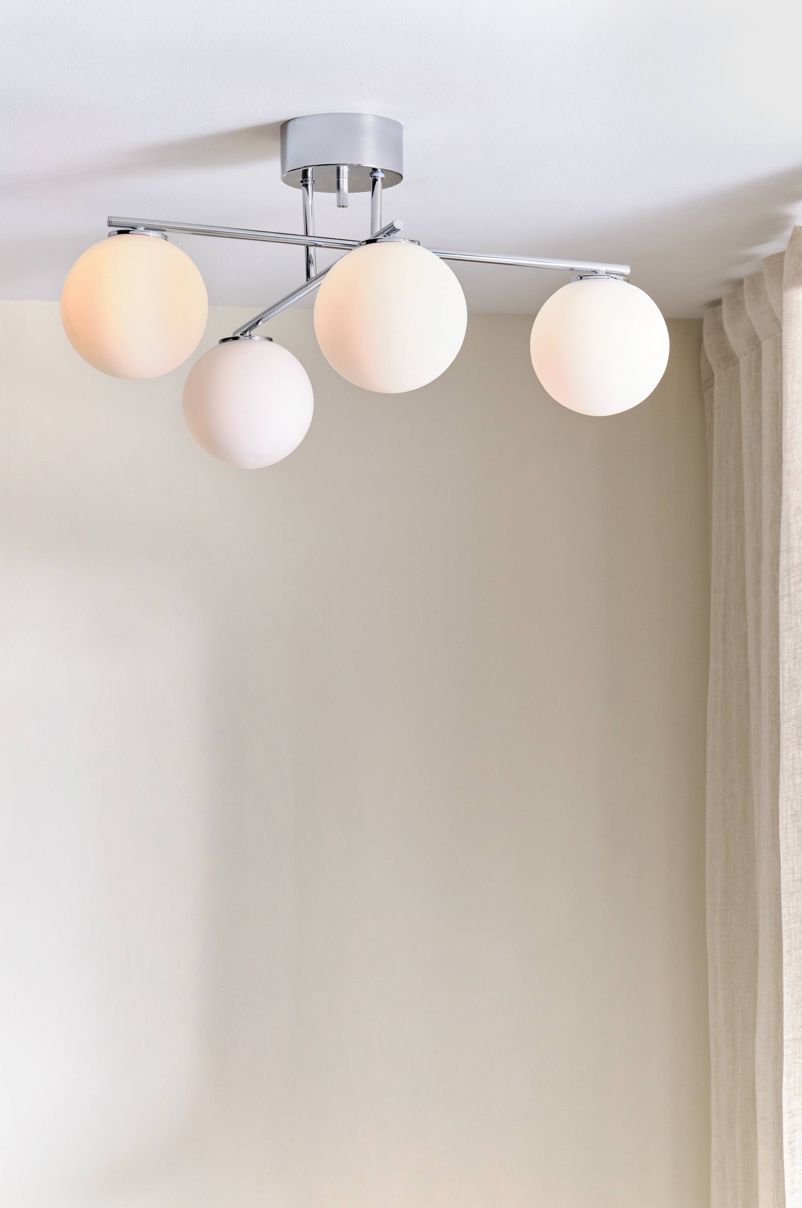 Plafondlamp van chroomkleurig metaal met vier bollen van wit opaalglas. De mooie bevestiging maakt de lamp stijlvol en elegant zonder opsmuk. Metalen plafondcup met een haak. De lamp is geaard, klasse 1. Op grond van EU-regelgeving is er in sommige landen een losse plafondstekker nodig. De plafondstekker moet geaard zijn (klasse 1) en wordt los verkocht.