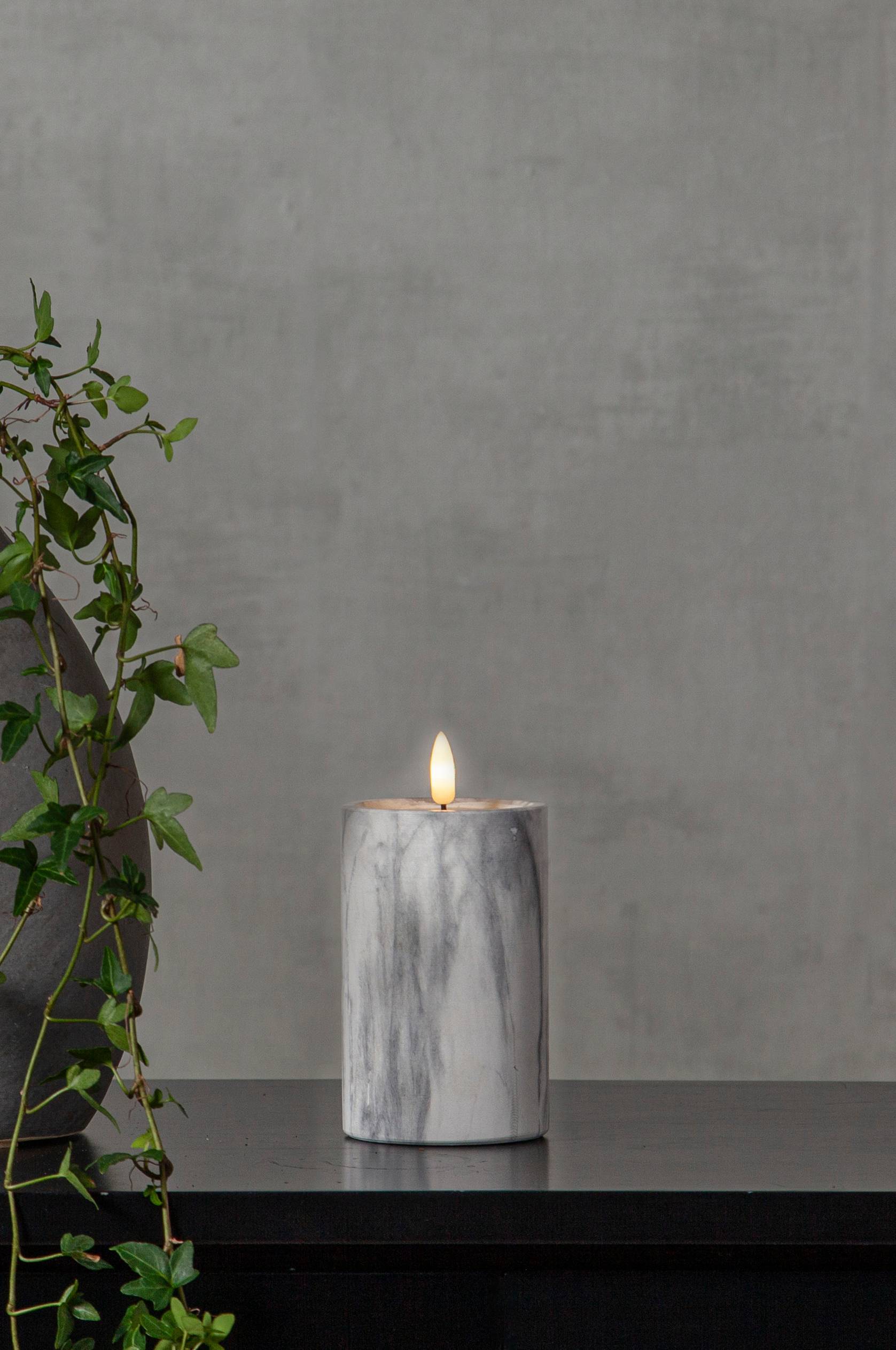 Een kaars van beton met een natuurgetrouw marmerdessin. De kaars werkt op batterijen en heeft led-verlichting, dus is volledig brandveilig. De natuurgetrouwe vlam geeft warmwit licht. Eenvoudig in te stellen met de timerfunctie. Het interval is herhalend 6 uur aan, 18 uur uit. Batterijcompartiment en vlammetje van kunststof. Voor gebruik binnen.