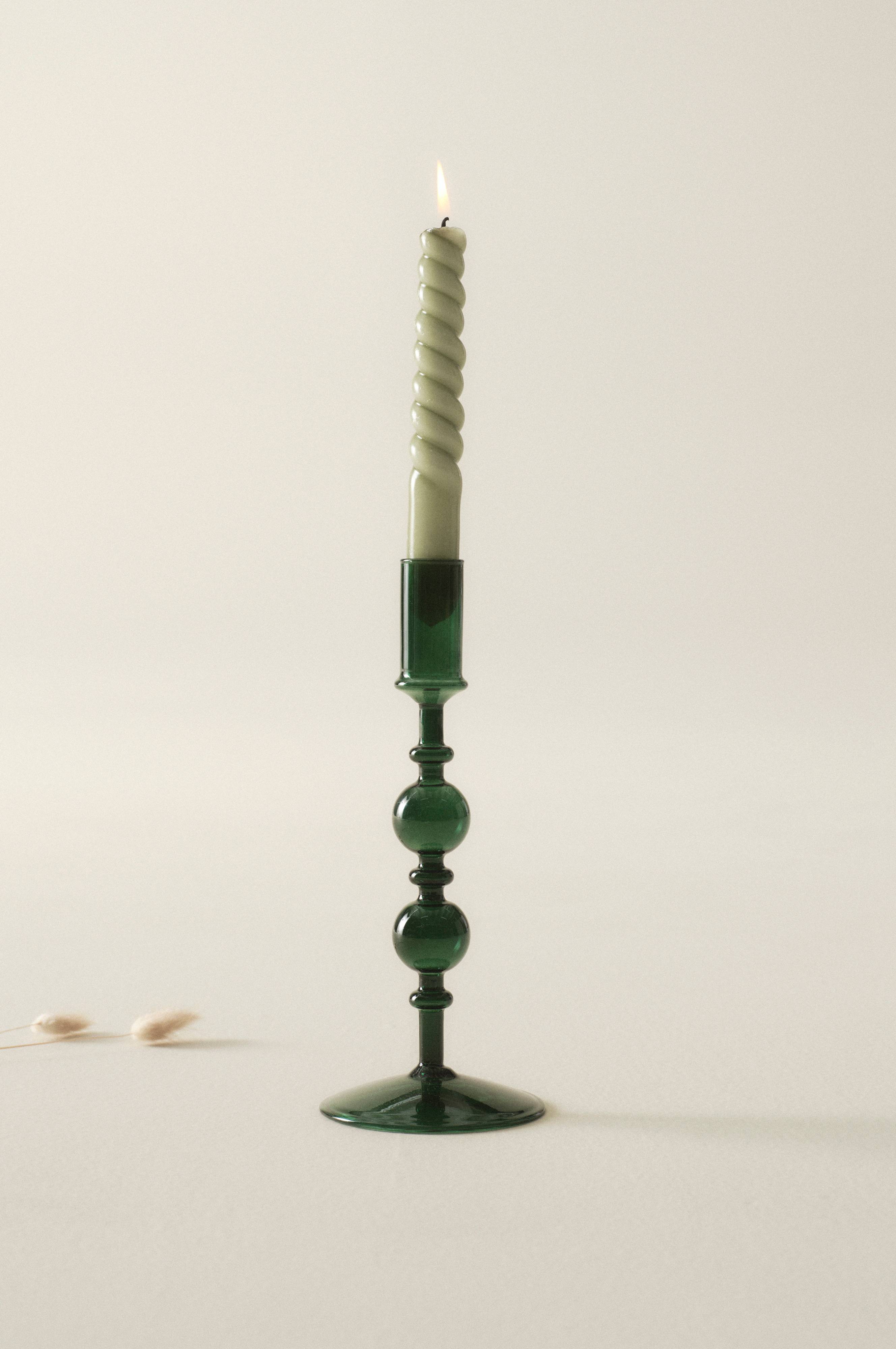 Een kandelaar van glas in een retroachtige vorm. Kandelaar FLORENCE is handgemaakt en verkrijgbaar in prachtige kleuren. Door het mooie handwerk is elke kandelaar uniek. Een kaars is niet inbegrepen.