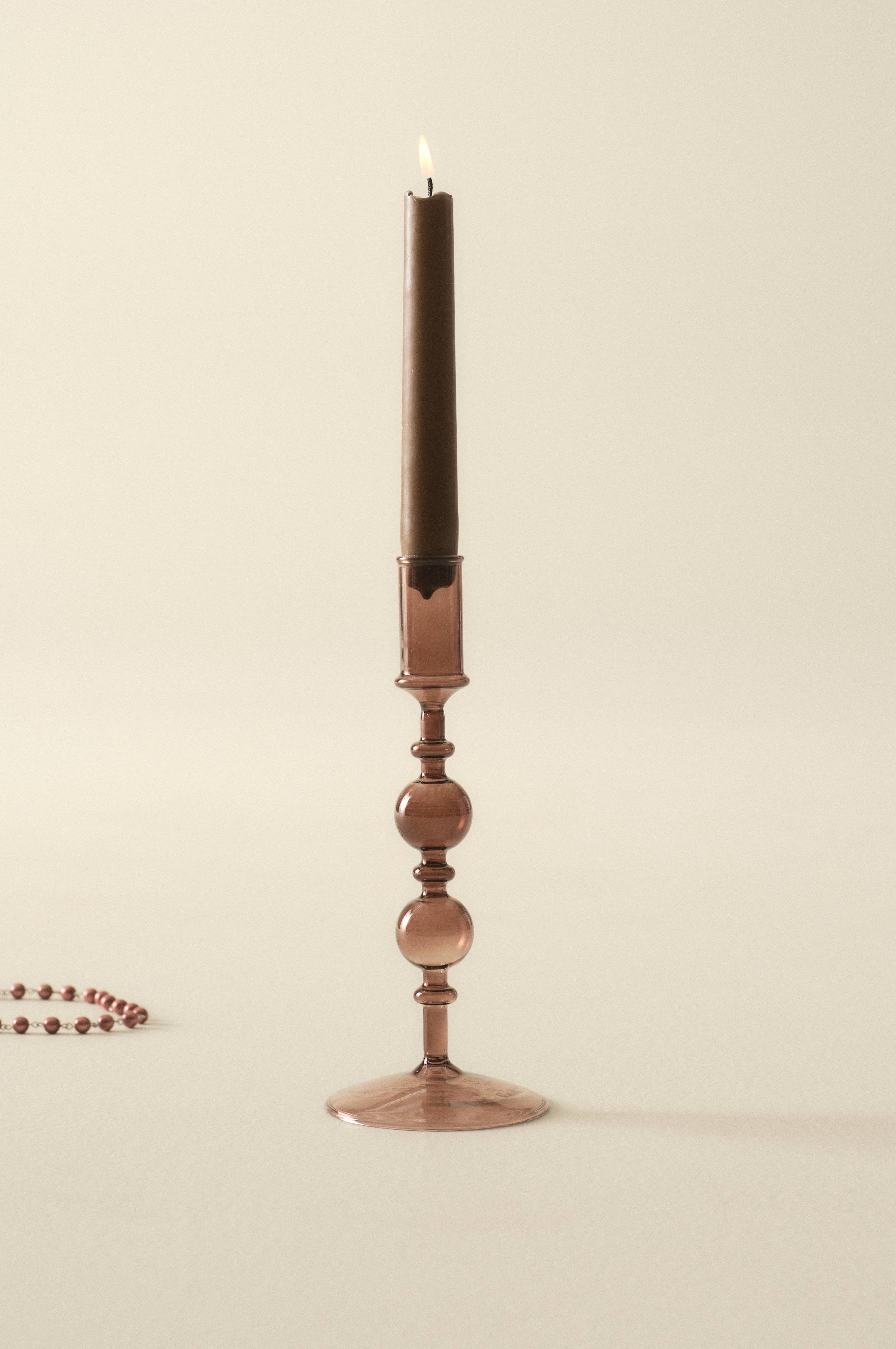 Een kandelaar van glas in een retroachtige vorm. Kandelaar FLORENCE is handgemaakt en verkrijgbaar in prachtige kleuren. Door het mooie handwerk is elke kandelaar uniek. Een kaars is niet inbegrepen.
