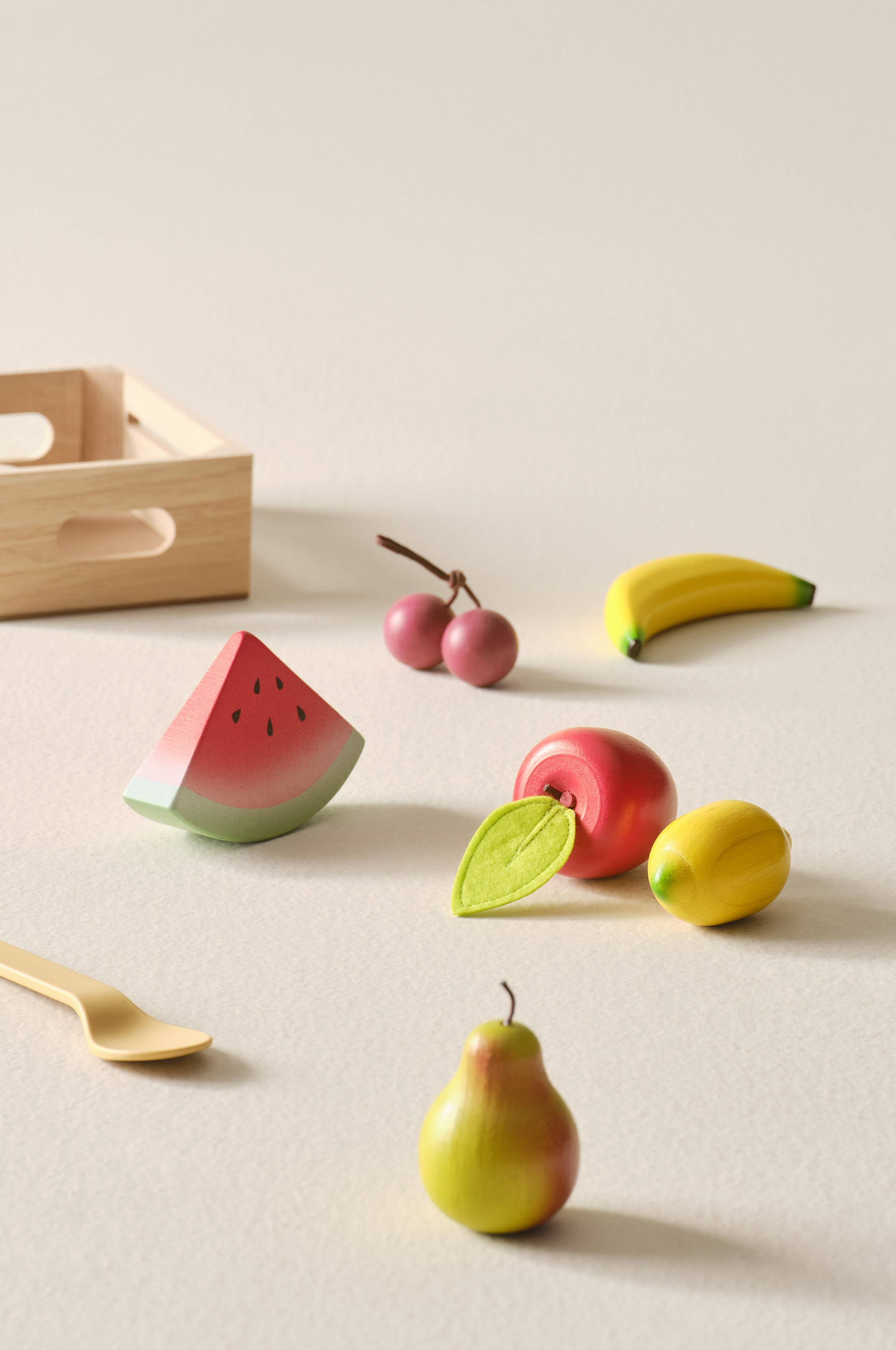 FRUIT speelgoedvoeding heeft een praktische opbergdoos voor elke kinderkamer. De doos is gemaakt van MDF en bevat leuke, kleurrijke vruchten gemaakt van rubberboom. Hij bevat watermeloen, citroen, appel, peer, banaan en kers. De vruchten zullen je kinderen veel speelplezier bezorgen.