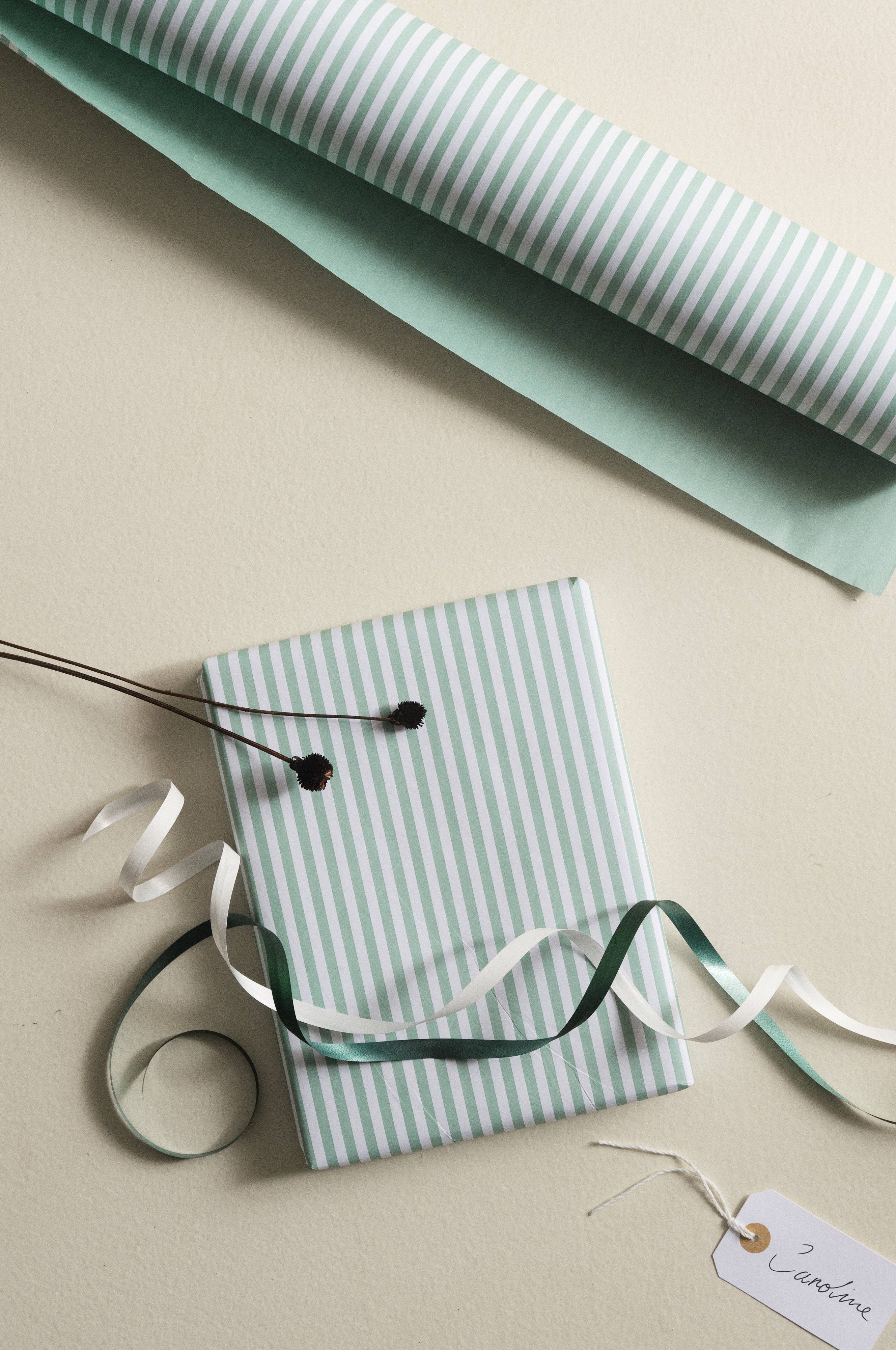 Gestreept cadeaupapier van FSC-gecertificeerd papier. Het papier heeft een print van lichte strepen aan de ene kant en de andere kant is effen in de donkerdere kleur. Met het cadeaupapier GEORGIA kun je dus effen en gestreepte pakjes maken voor leuke variatie. Gemaakt in Zweden. Oppervlaktegewicht 80 gr./m².