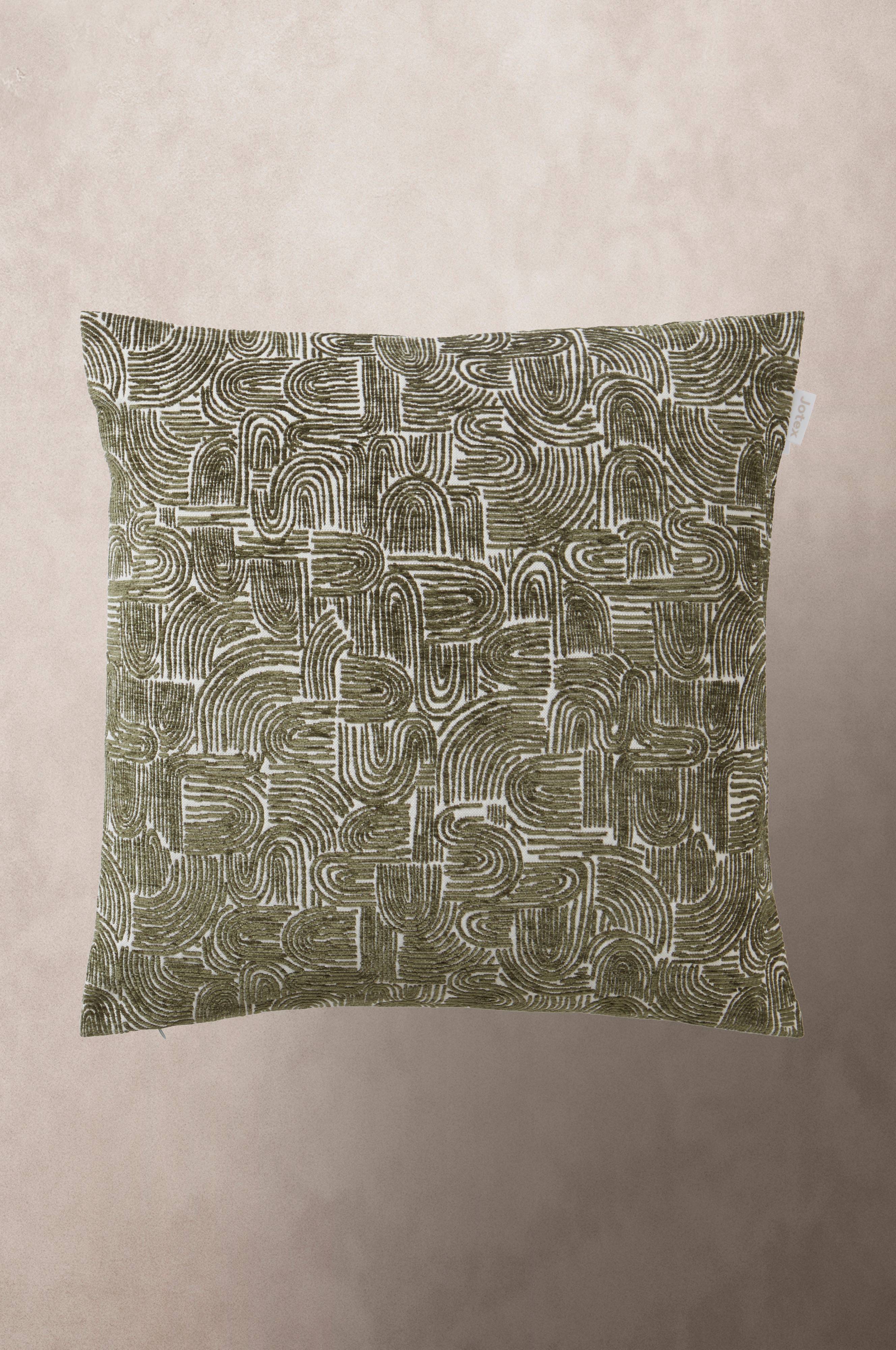 Een kussenhoes met een jacquardgeweven dessin. Een prachtige wirwar van gekleurde boogjes op de witte stof zorgt voor een mooi dessin dat goed past in een modern huis, maar ook in een huis met retrolook. Zowel de voorkant als de achterkant zijn gedessineerd. Ritssluiting aan de onderkant. Gramsgewicht stof 420 gr./m².