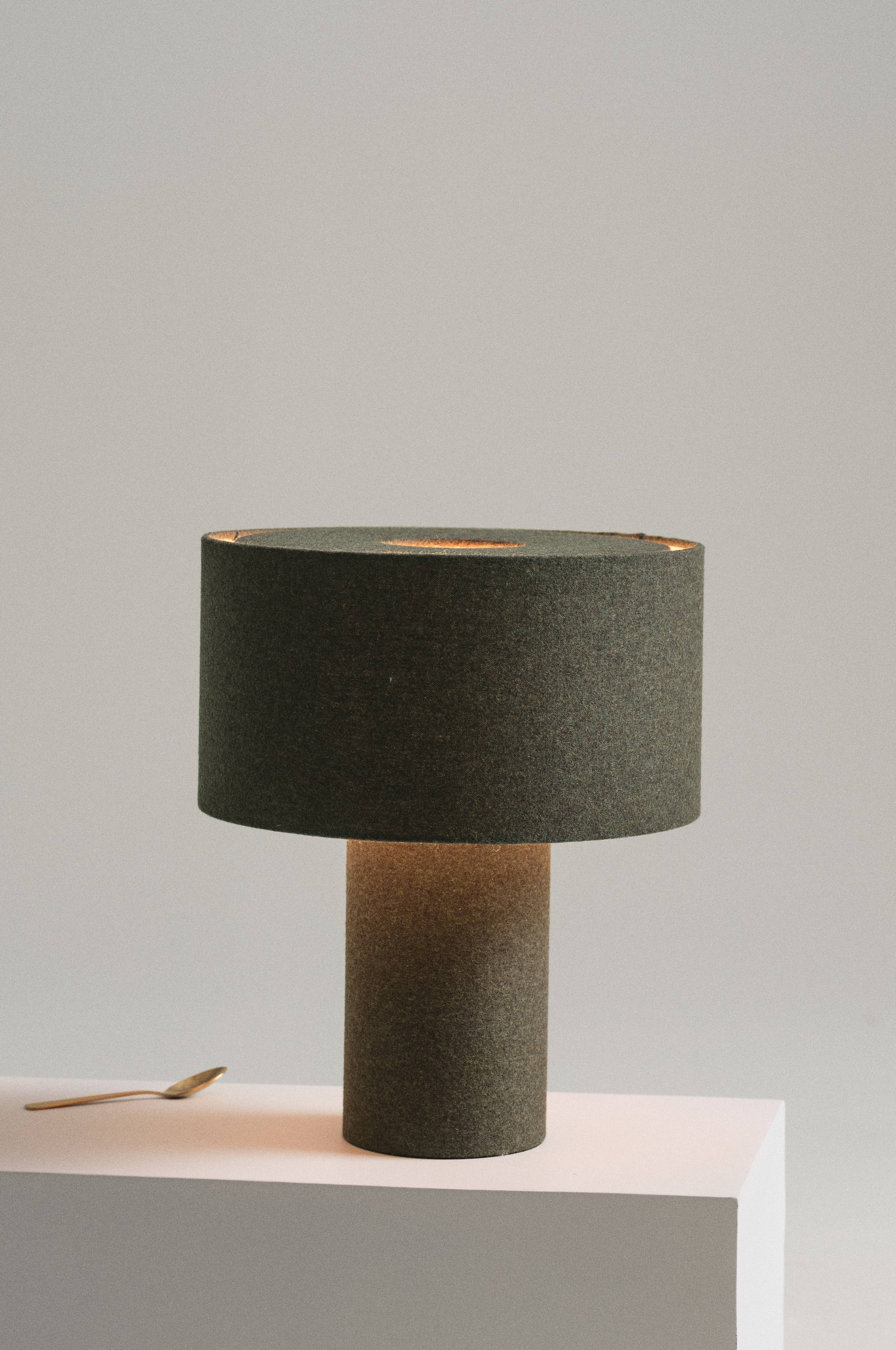 Een tafellamp van zachte viltstof in een natuurlijke kleur. Zwart textielsnoer.