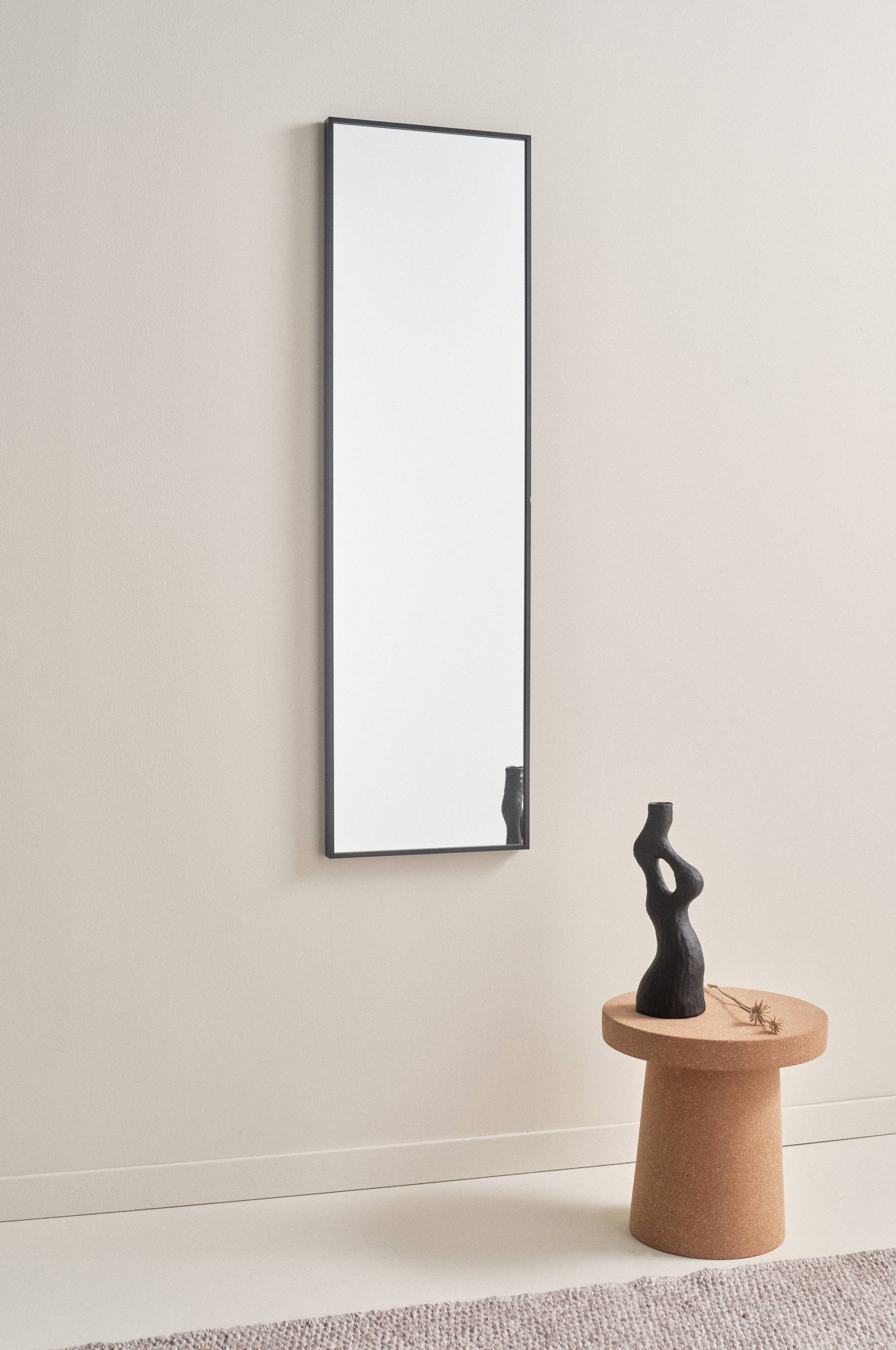 Rechthoekige spiegel met een prachtige aluminium lijst. De lijst heeft een verborgen versteviging van mdf. Drie blinde haakjes aan de achterkant om de spiegel horizontaal of verticaal op te hangen.