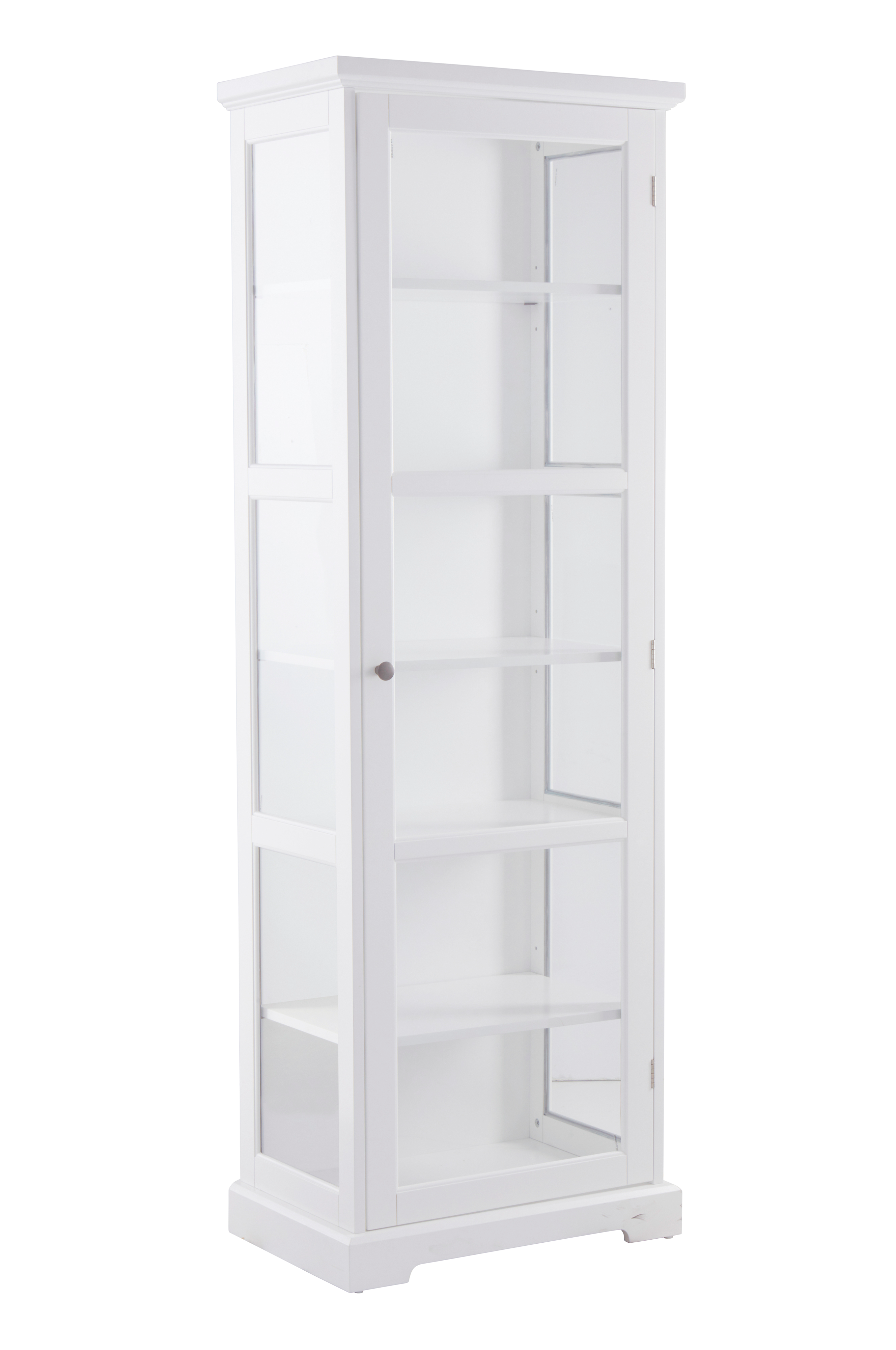 Een vitrinekast in mdf met glazen deuren en zilveren knoppen. De diepe planken zorgen ervoor dat je veel voorwerpen kunt tentoonstellen. Maximale belasting van de planken: 20 kg. Wordt ongemonteerd geleverd. Montage-instructies worden meegeleverd.