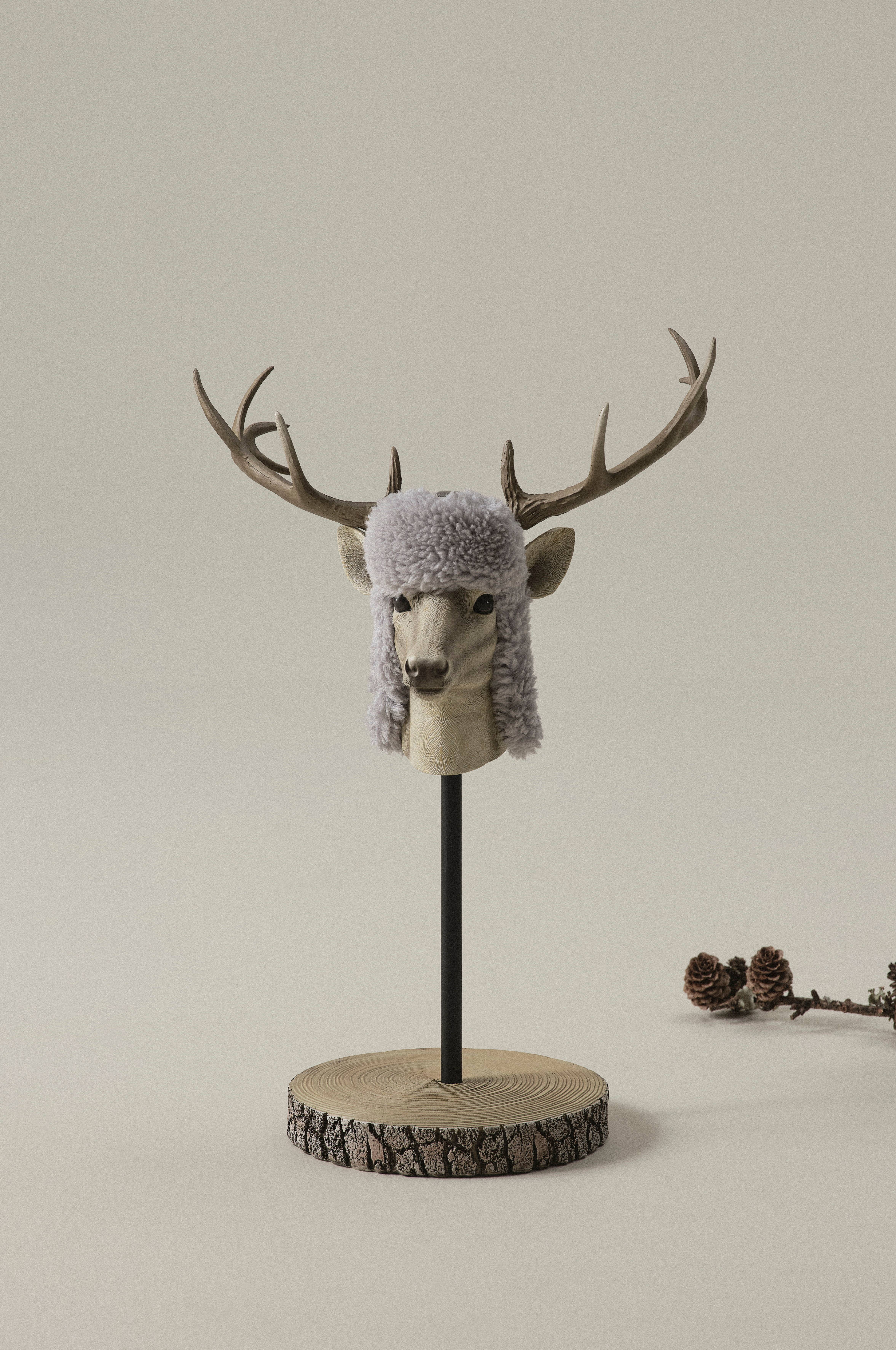 Handgemaakt decoratief beeldje van dolomietporselein met bontmuts van polyester. De hertenkop staat op een ronde plaat die eruitziet als een houten paneel. Het mooie handwerk maakt elke decoratie uniek.