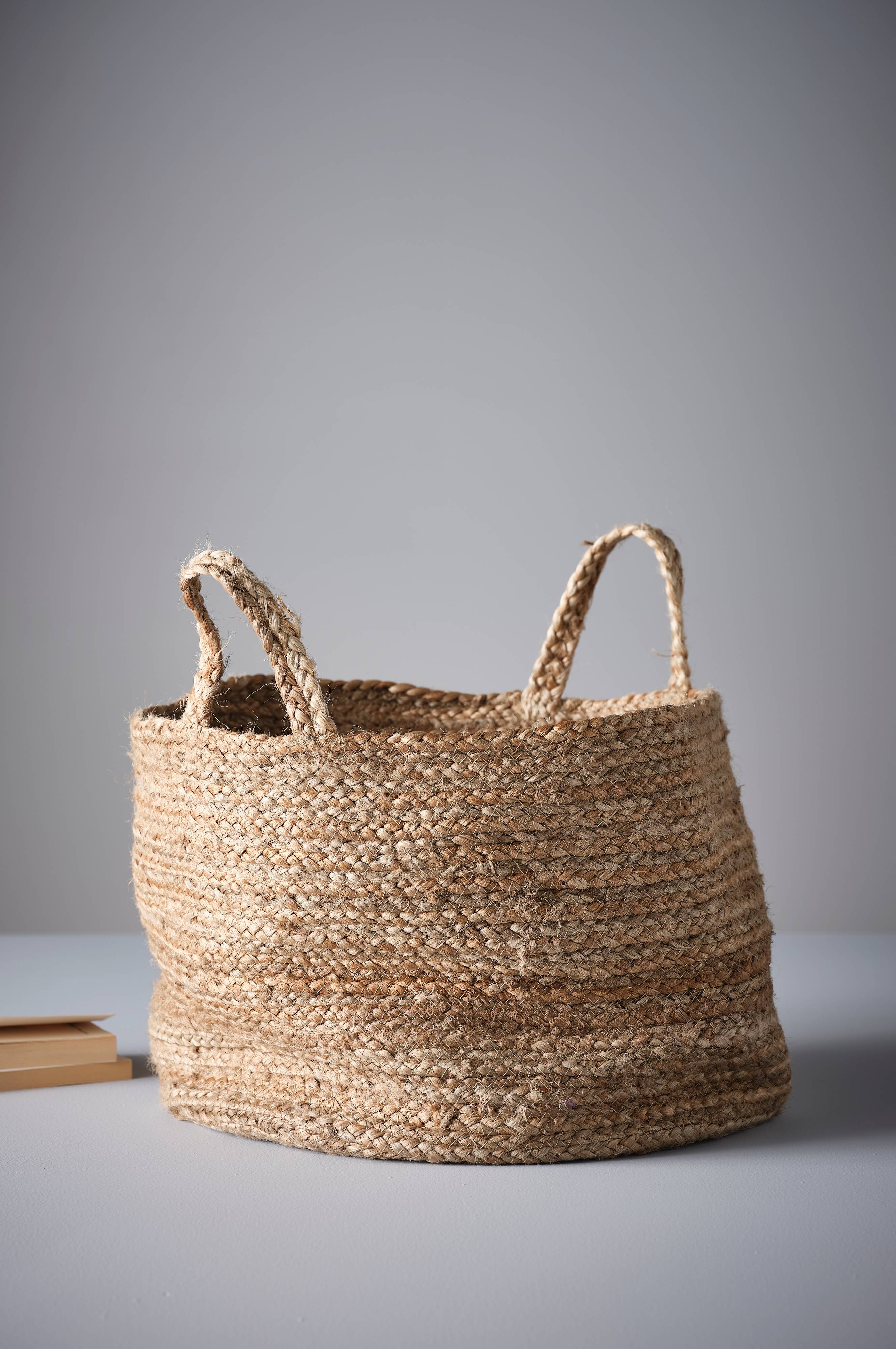 Omschrijving: Een mand van gevlochten jute met twee handgrepen.