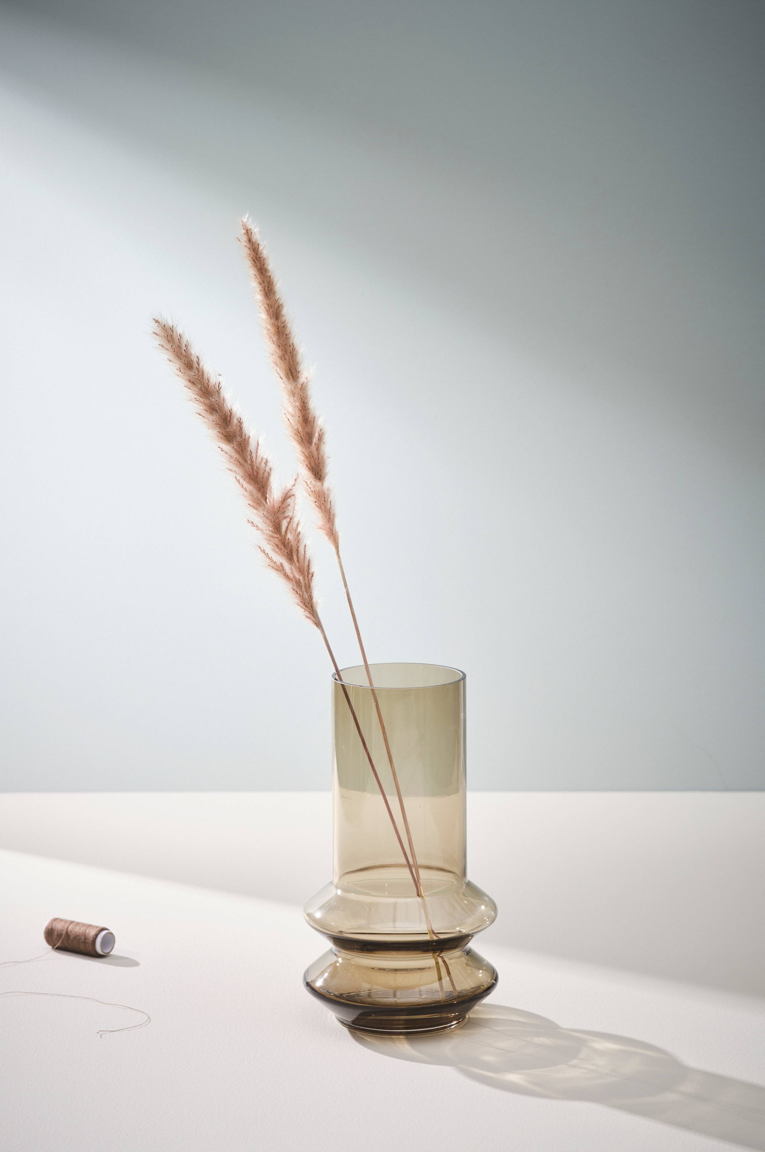 Een glazen vaas in een stijlvolle retro vorm. HAZE is even decoratief met als zonder bloemen erin.