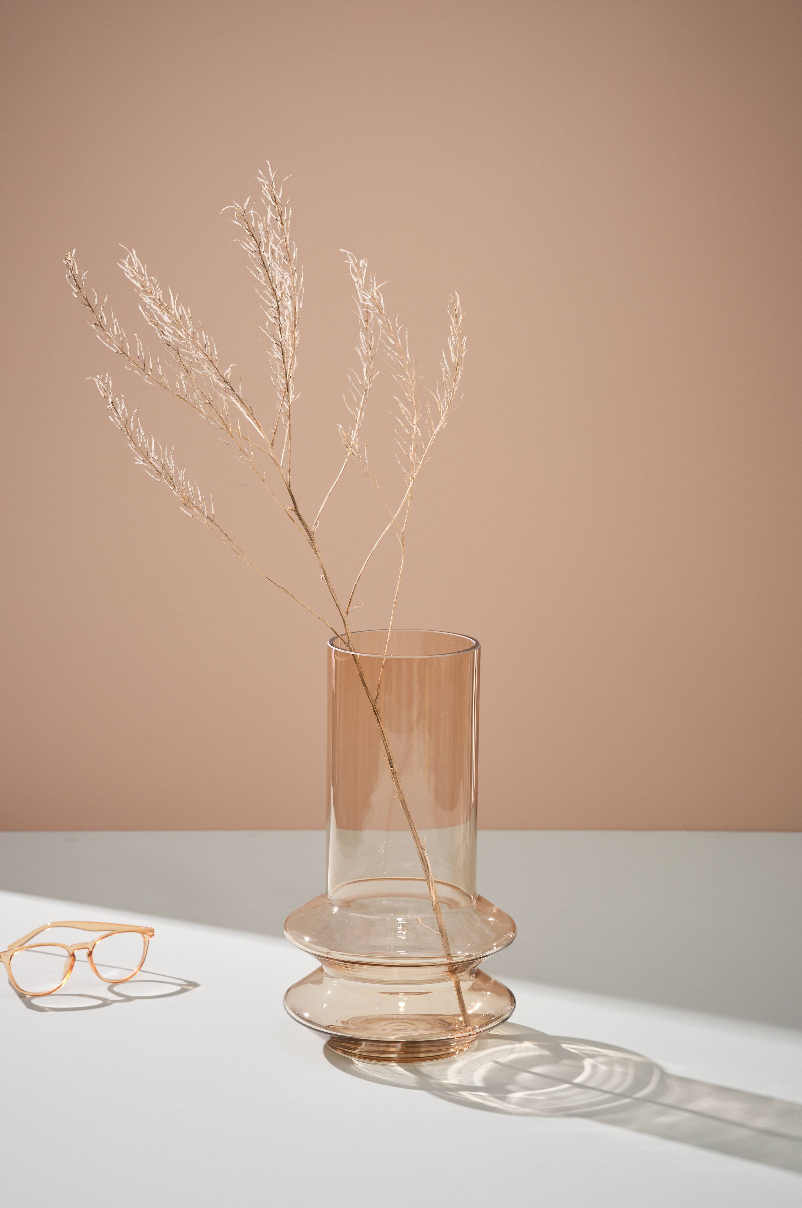 Een glazen vaas in een stijlvolle retro vorm. HAZE is even decoratief met als zonder bloemen erin.