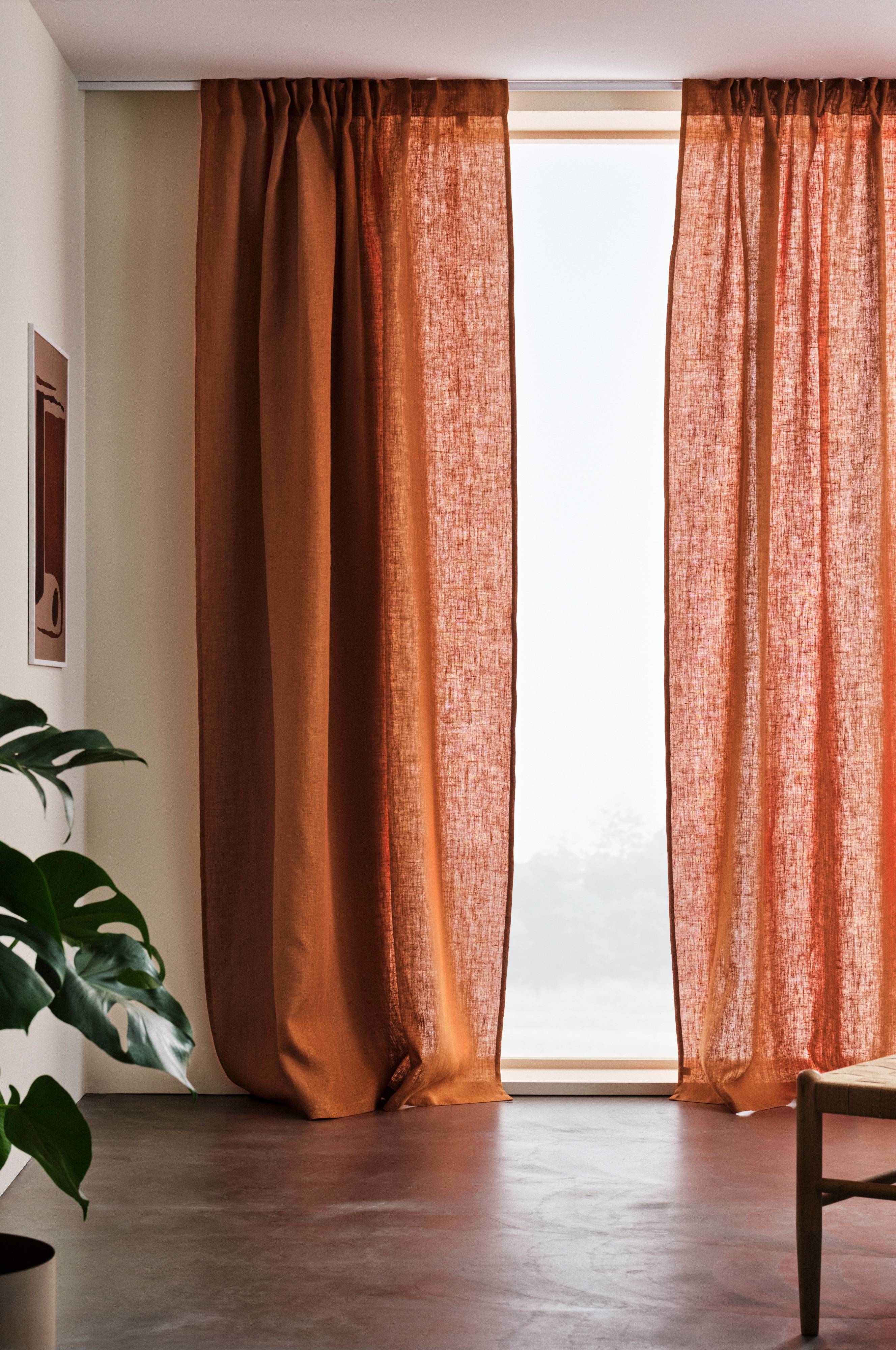 Een set van twee effen gordijnen van heerlijk linnen met een fijne textuur dat luxueus aanvoelt. Met vastgestikt multifunctioneel band. Het gordijn kan met vingerhaken, roedetunnel of blinde lussen worden opgehangen.