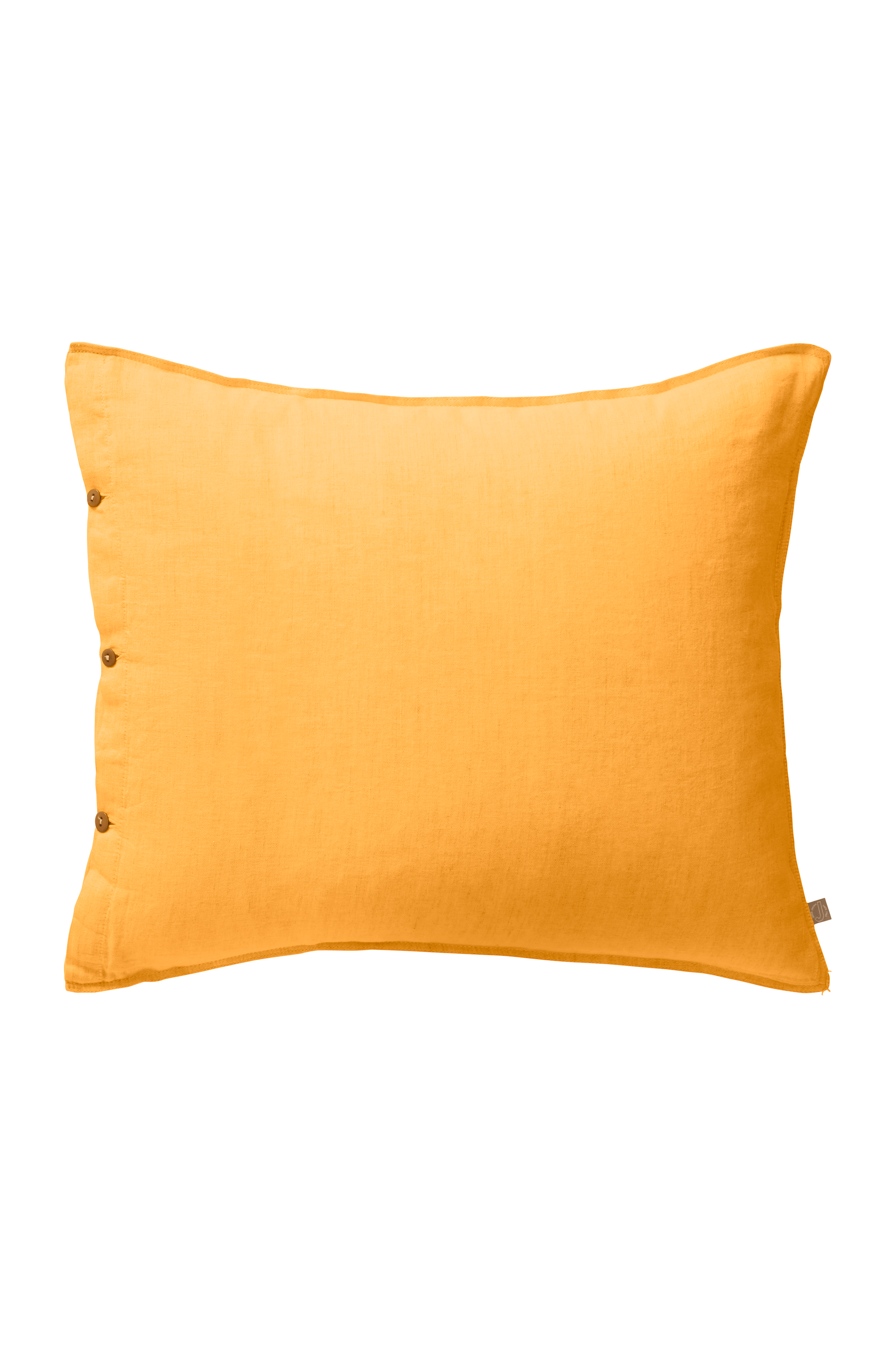 Een kussensloop van gewassen linnen/katoenmix. Dubbele stiknaden en een sluiting met knopen. Draaddichtheid 92. (De draaddichtheid geeft het aantal draden aan per vierkante inch van een stof. Hoe hoger de draaddichtheid, hoe hoger de kwaliteit. Linnen en linnenmix worden voor het juiste resultaat vaak wat losser geweven.)