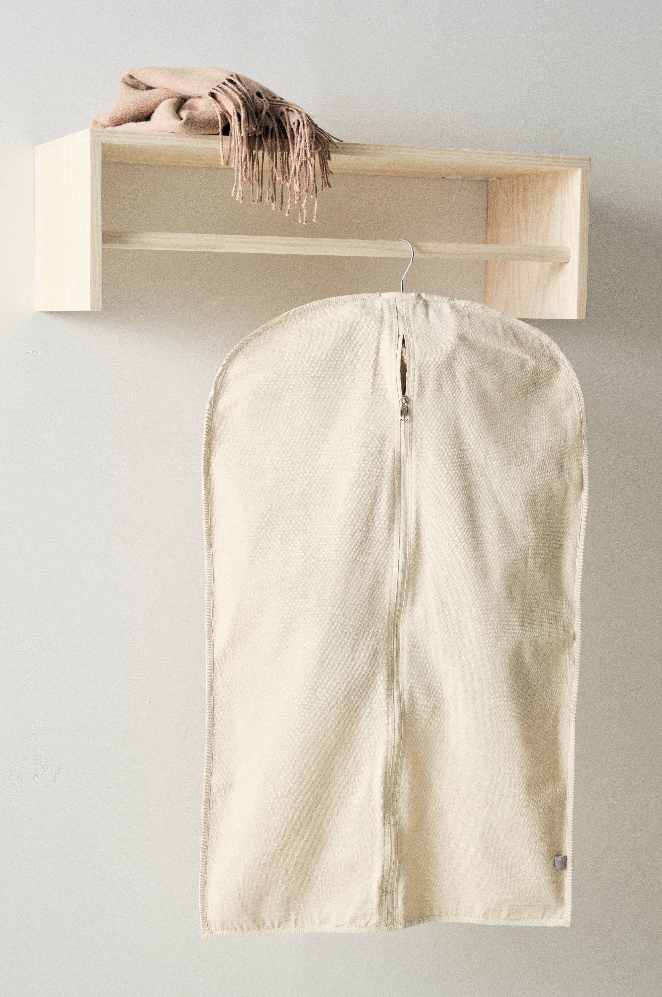 Een kledinghoes van katoen met een rits voor en een opening boven voor de kleerhanger waar je bijvoorbeeld je blazer of blouse aan hebt gehangen. Vervolgens kun je je kledingstuk beschermd in je kledingkast of in de auto ophangen. Een kledinghoes is heel handig en beschermt je kleding, of je nu thuis of op reis bent.