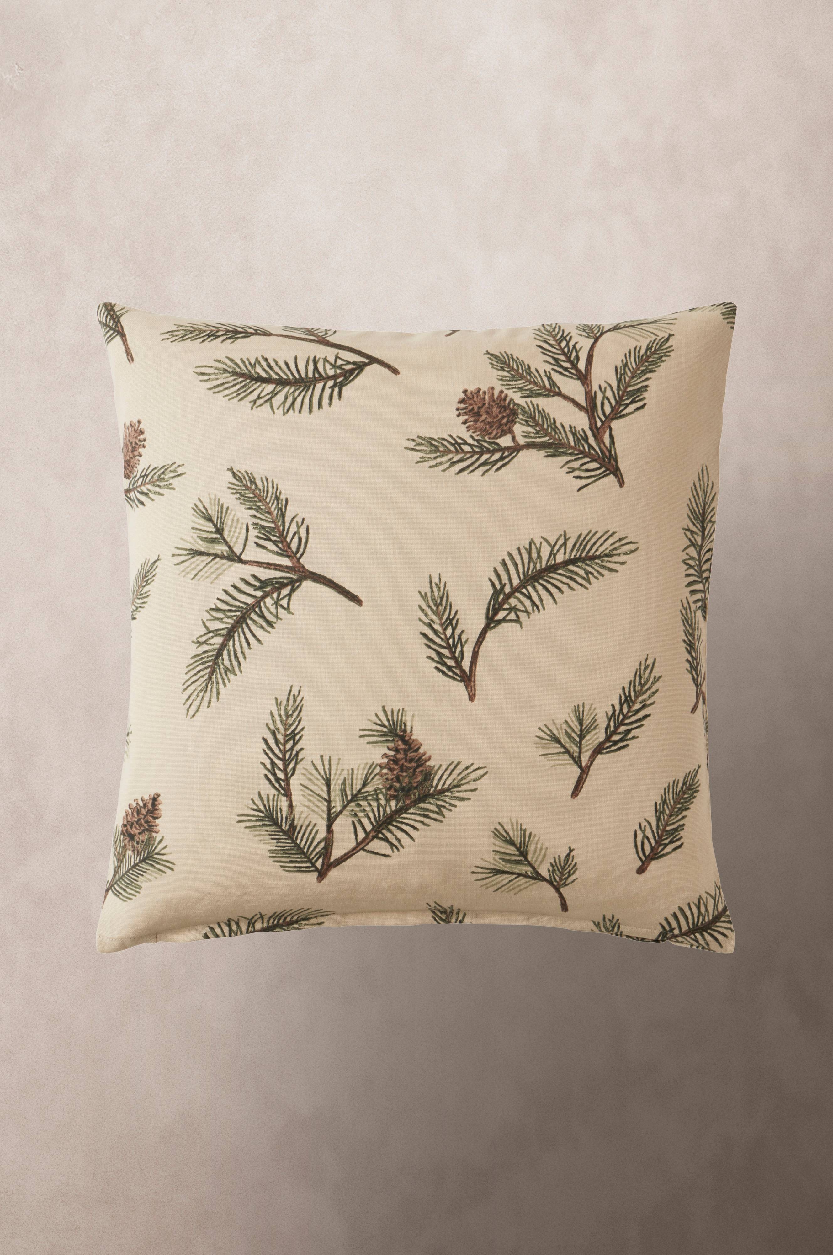 Een kussenhoes van stevig, en tegelijkertijd iets losser geweven katoen. Ritssluiting aan de onderkant. Dennenappels en dennentakken geven HOLLY een heerlijke natuurlijke uitstraling, de print is geïnspireerd op onze mooie bossen en creëert een heerlijke sfeer voor kerst, maar is het hele jaar door prachtig.