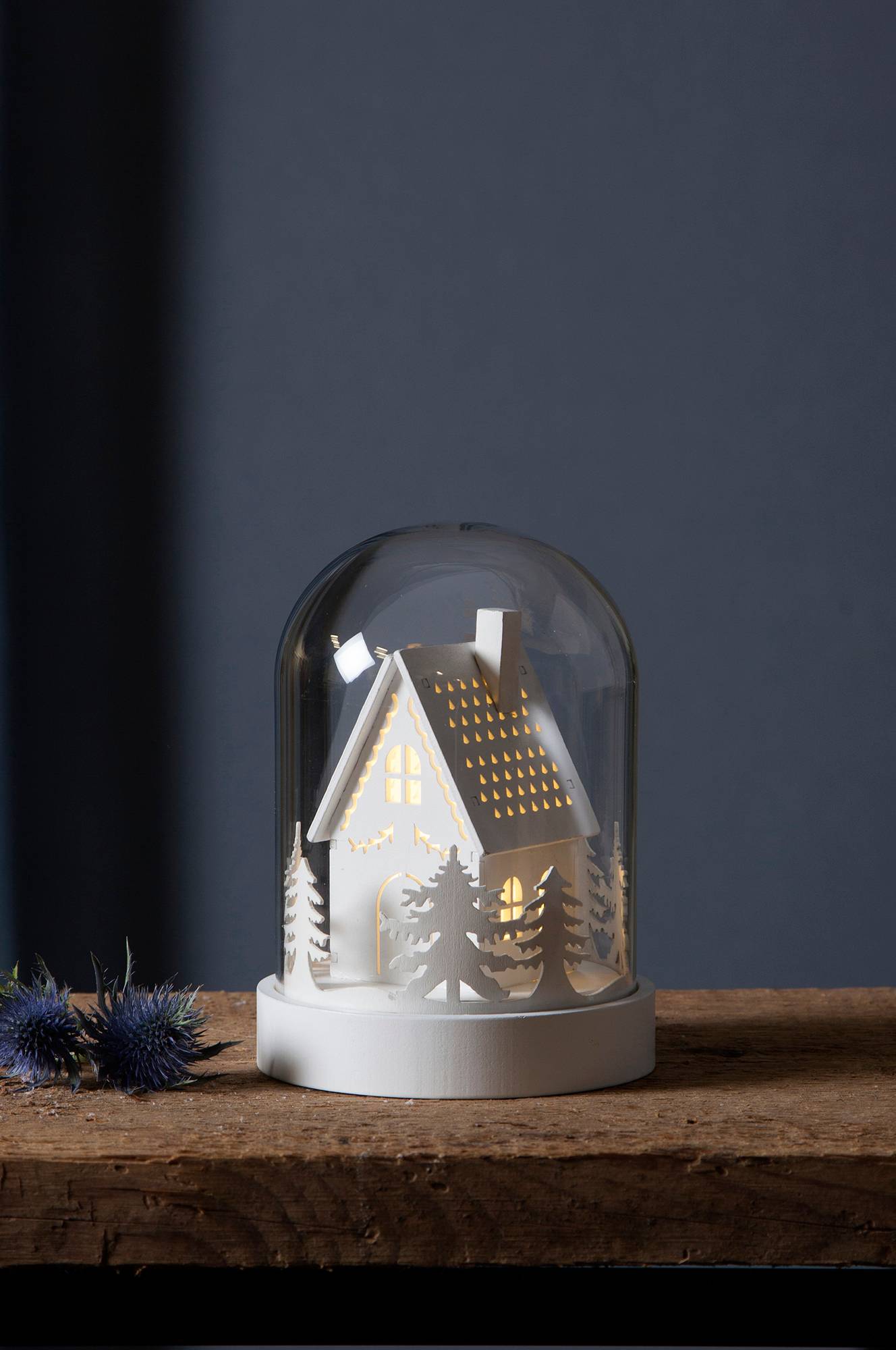 Een mooie, opvallende lichtstolp die een gezellige sfeer creëert. De stolp heeft ledlicht aan de binnenkant dat warmwit licht geeft. Het licht werkt op batterijen en heeft een ingebouwde timer. Batterijen niet inbegrepen. Diepte 12,5 cm, hoogte 17,5 cm, breedte 12,5 cm.