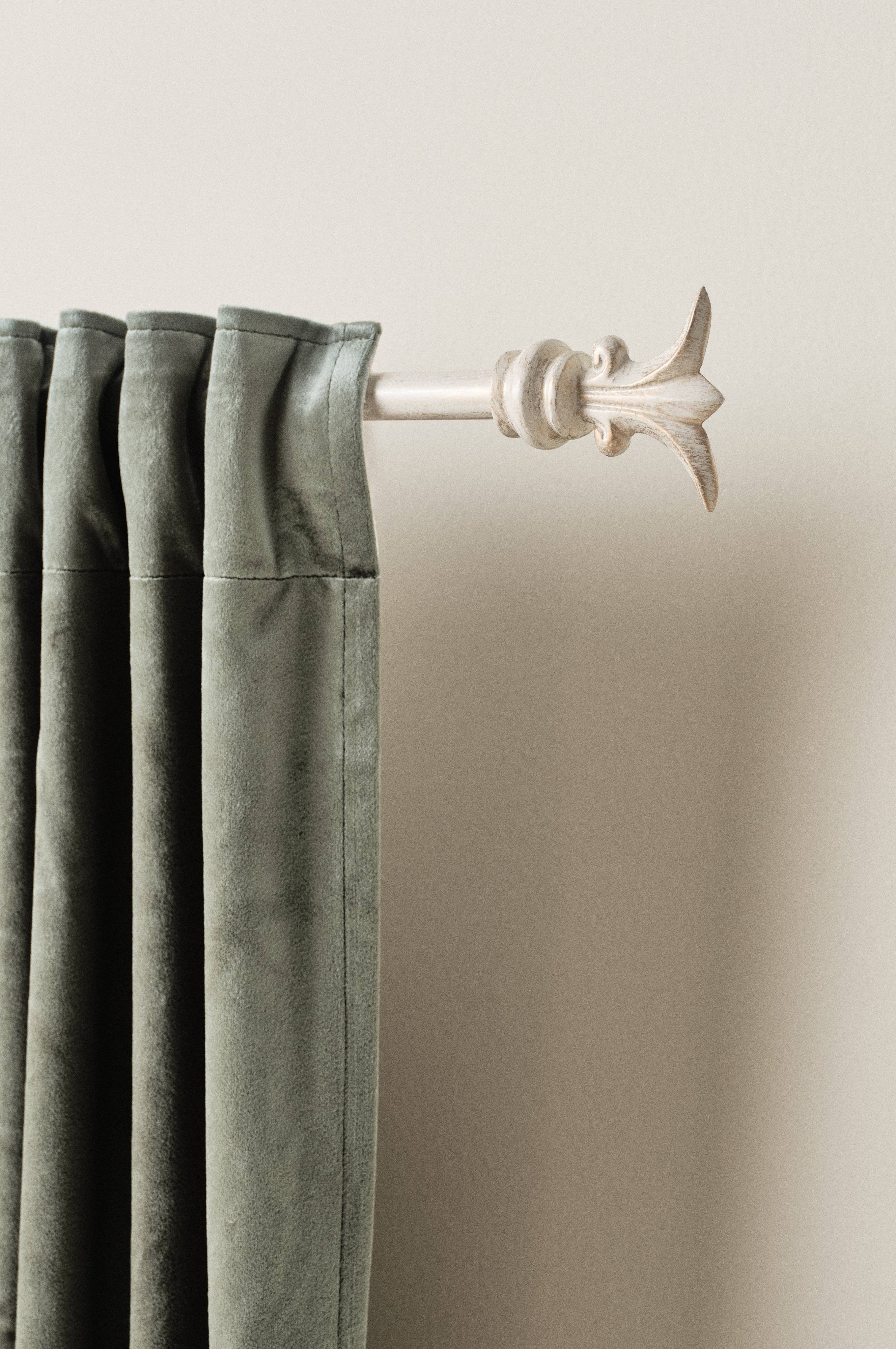 Een roede van metaal met sierknoppen aan de uiteinden. Verstelbare lengte 67-180 cm, ø 1,6/1,9 cm. Wandbeslag en schroeven worden meegeleverd. Afstand van de muur ca. 10 cm. Decoraties van metaal. 8x7 cm.