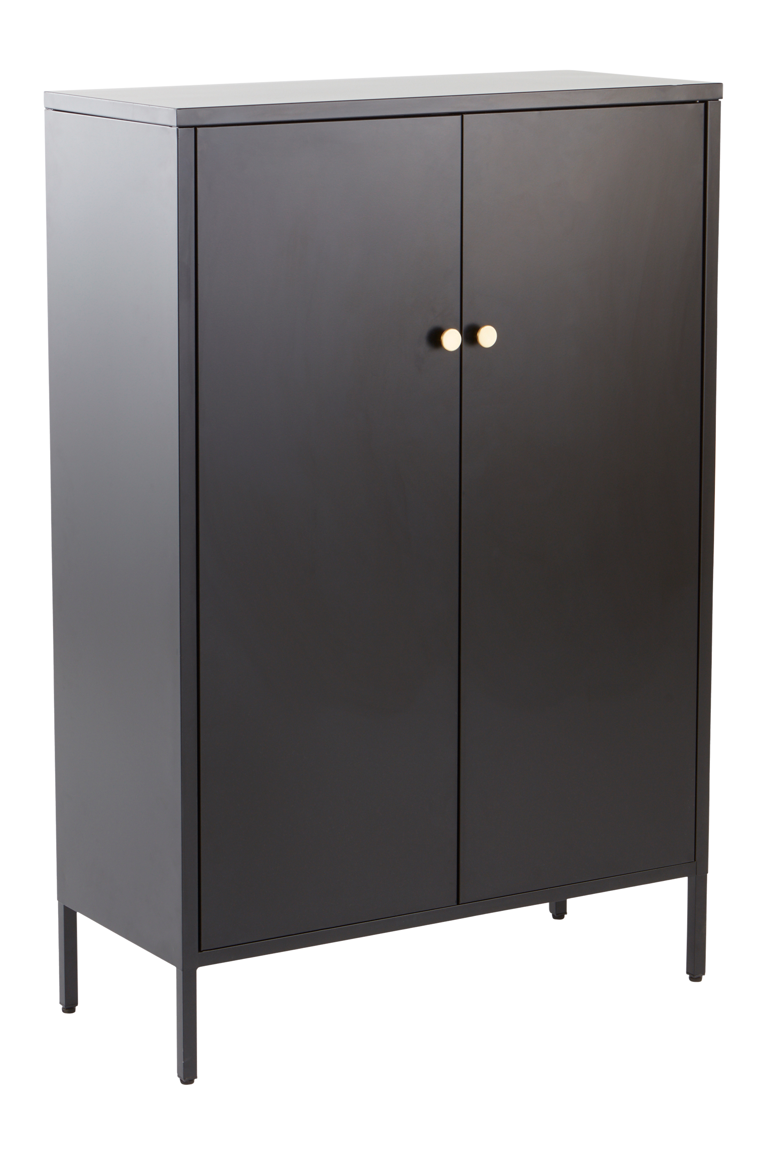 Een schoenenkast van staal met een matte poedercoating. De kast heeft dubbele deuren met een goudkleurige metalen knop. Achter de deuren kun je veel schoenen kwijt. De kast heeft vijf verplaatsbare planken, zodat je de ruimte optimaal kunt benutten. Lage sneakers hebben minder ruimte nodig dan laarzen. Als de planken gelijkmatig verdeeld zijn, is de ruimte tussen de planken 30 cm. De deuren gaan gemakkelijk open en hebben een magneetsluiting. Wandbeslag en schroeven worden meegeleverd. Enige montage is vereist. Montage-instructies worden meegeleverd.