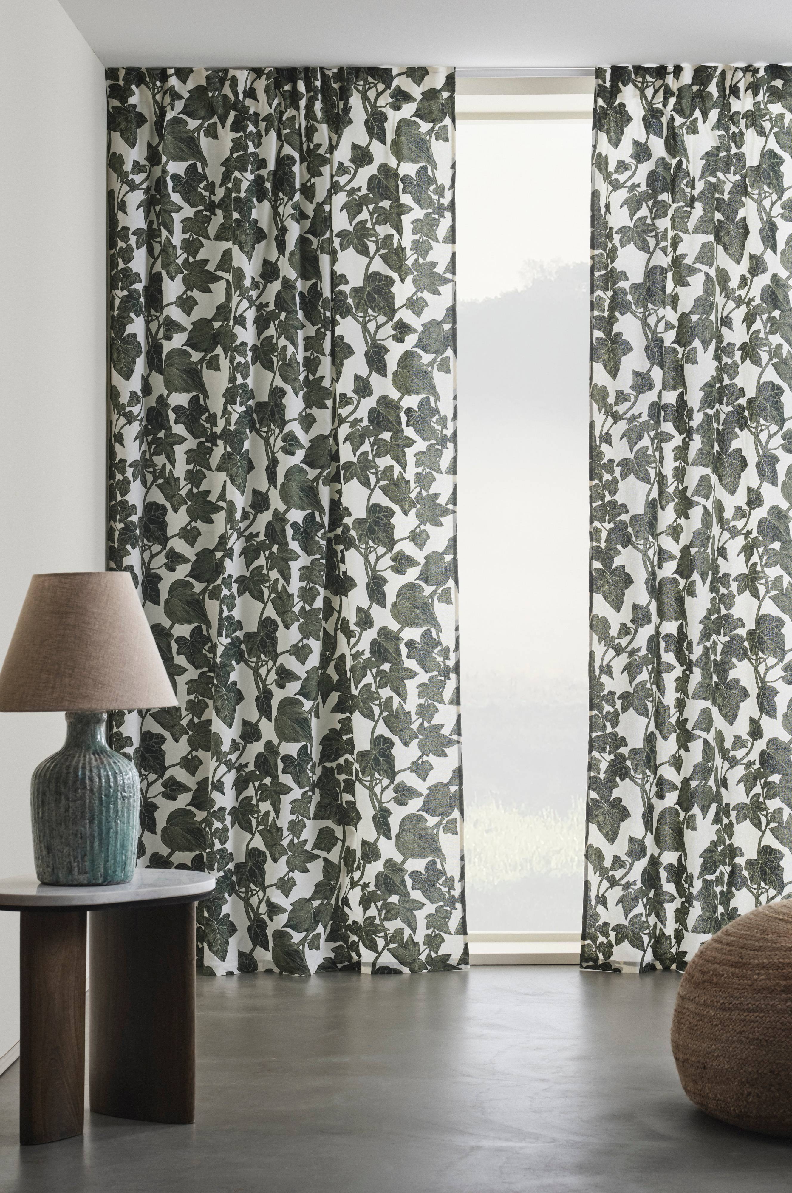 Twee gordijnen met een vastgestikt multifunctioneel gordijnband. IVY is een opvallende, uitnodigende collectie gemaakt van katoen. De klimopprint op een natuurwitte achtergrond heeft een natuurlijke uitstraling. De kwaliteit heeft een mooie ingeweven structuur. Het gordijn kan met vingerhaken, roedetunnel of blinde lussen worden opgehangen.