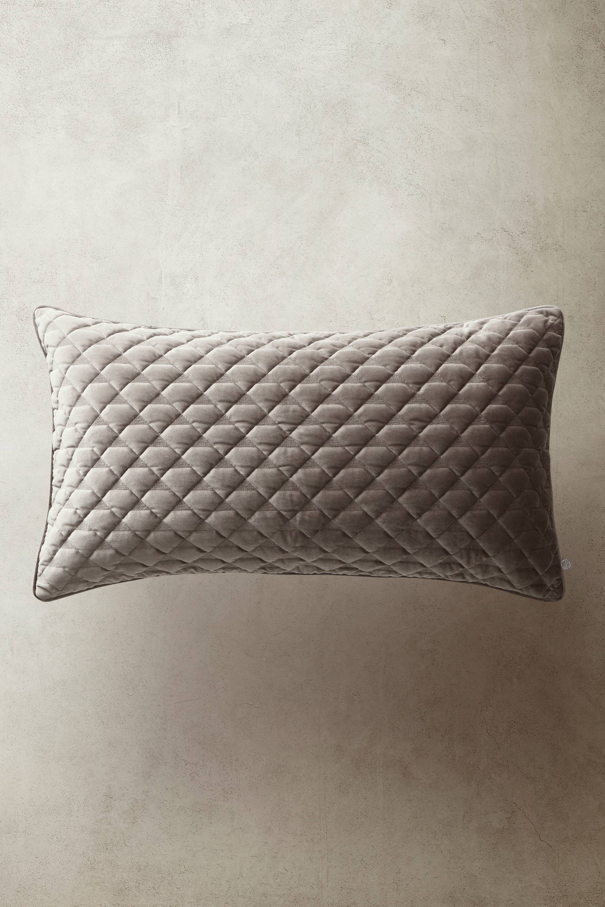 Een kussenhoes van zijdezacht fluweel met een doorgestikt ruitdessin voor en een biesje rondom. De doorgestikte voorkant is licht gewatteerd en gevoerd. Ritssluiting aan de onderkant.