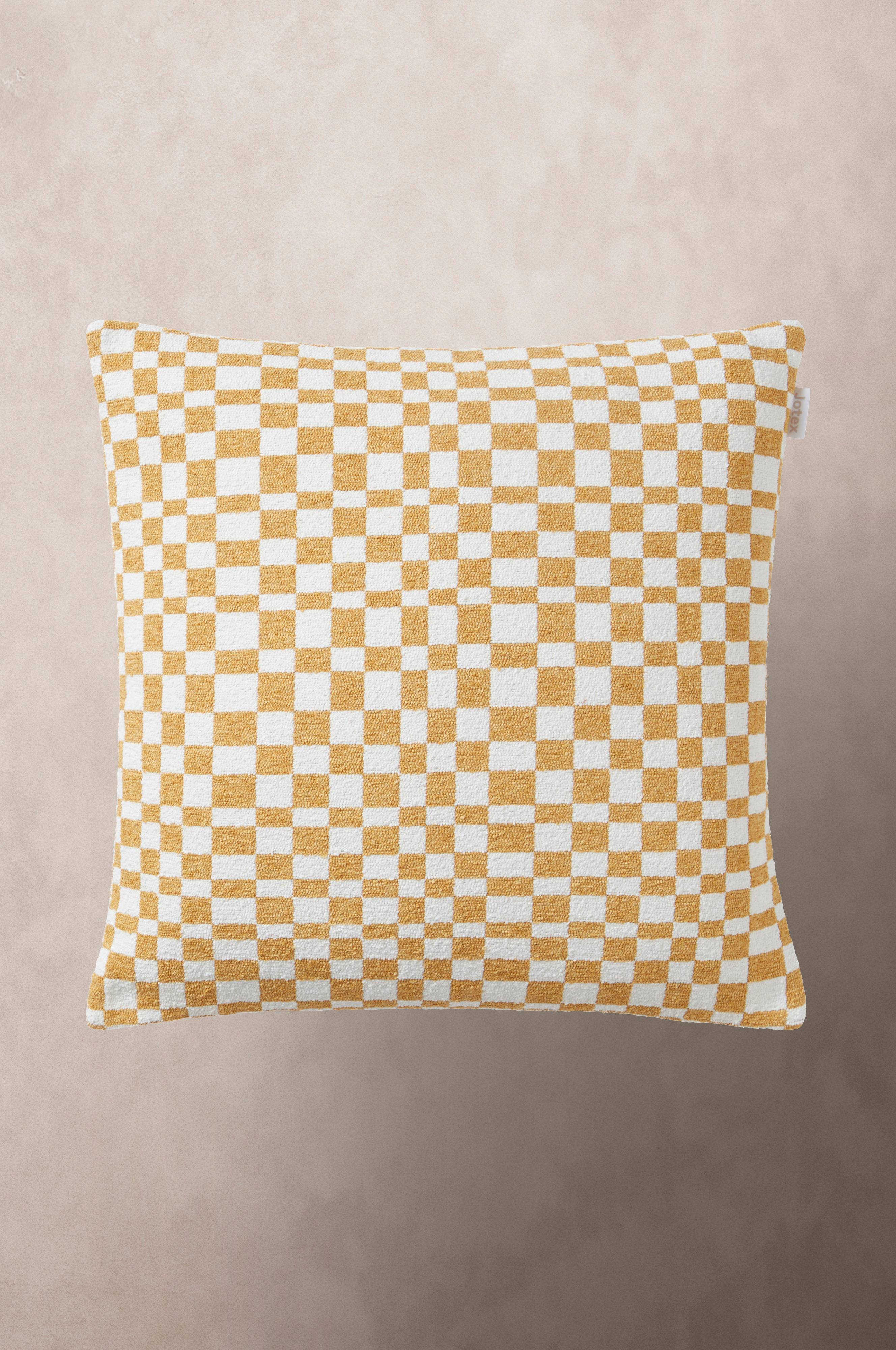Een kussenhoes met een jacquardgeweven dessin. De onregelmatige vierkanten zijn wit in combinatie met een heldere primaire kleur en het lijkt een beetje op een fantasierijk schaakbord. De stof is stevig en iets grover en zowel de voorkant als de achterkant zijn gedessineerd. Ritssluiting aan de onderkant. Gramsgewicht stof 760 gr./m².