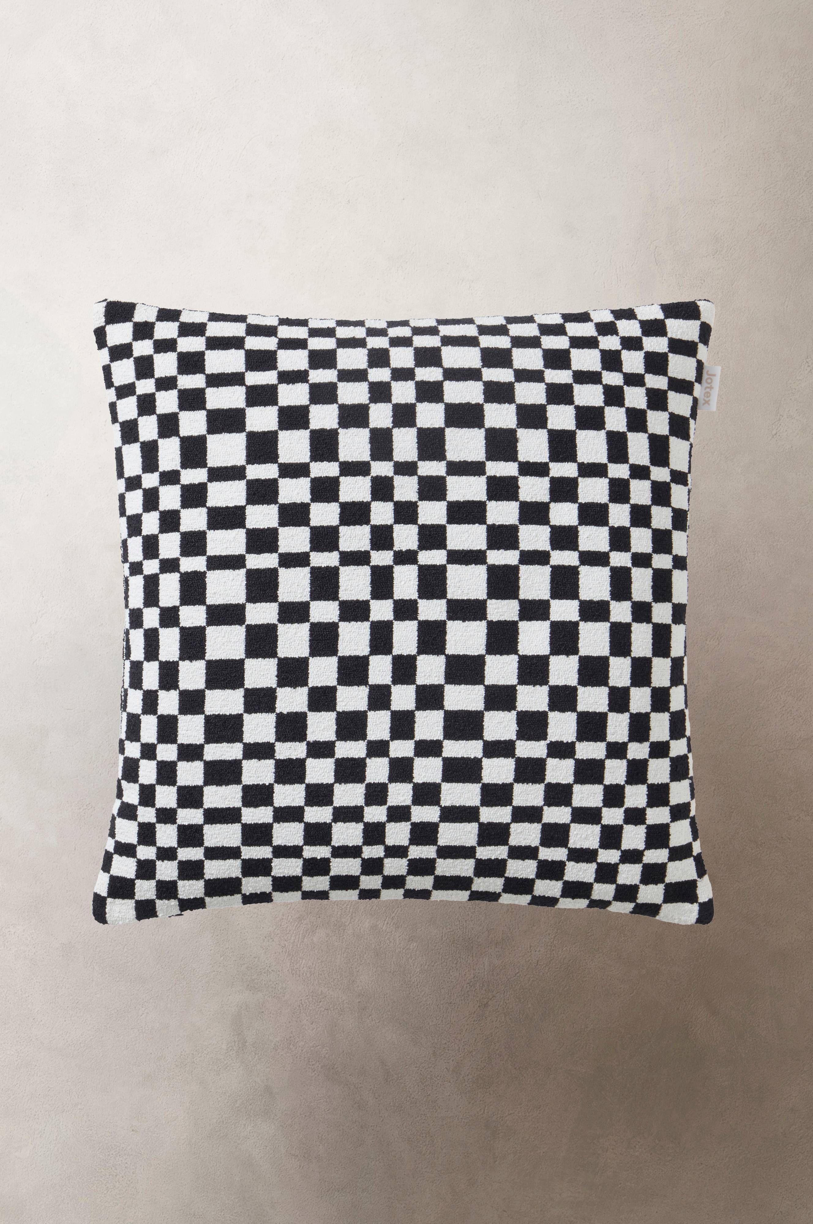 Een kussenhoes met een jacquardgeweven dessin. De onregelmatige vierkanten zijn wit in combinatie met een heldere primaire kleur en het lijkt een beetje op een fantasierijk schaakbord. De stof is stevig en iets grover en zowel de voorkant als de achterkant zijn gedessineerd. Ritssluiting aan de onderkant. Gramsgewicht stof 760 gr./m².