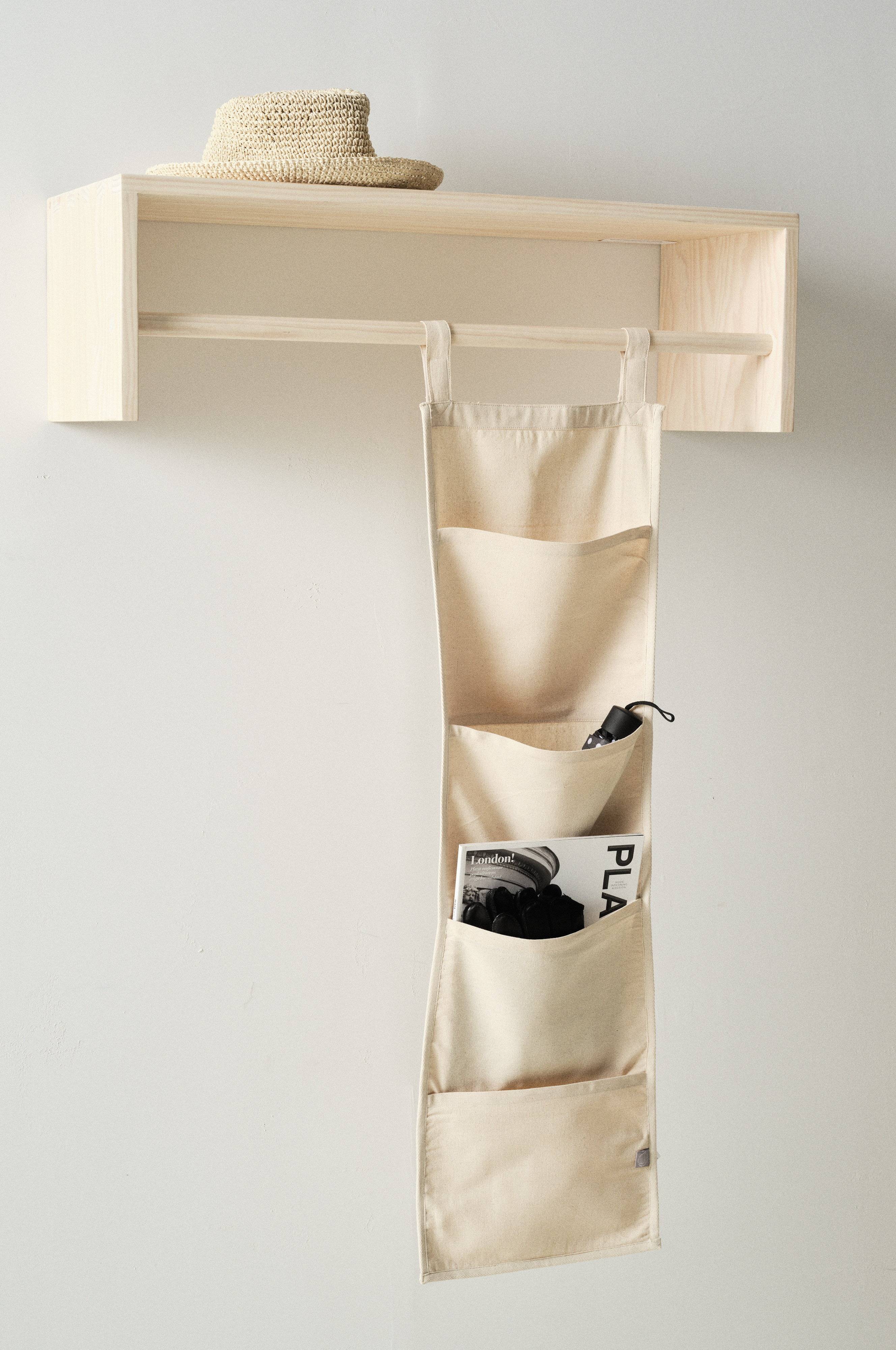 Een wandopberger van katoen met vier praktische zakken. Bovenaan heeft de opberger twee lussen met klittenband, zodat je hem eenvoudig aan een kledingstang, roede of kleerhanger kunt hangen. De vier zakken hebben karton aan de binnenkant voor extra stevigheid. De opbergzakken zijn ideaal in de hal, de kinderkamer en waar je ook maar extra opbergruimte kunt gebruiken.