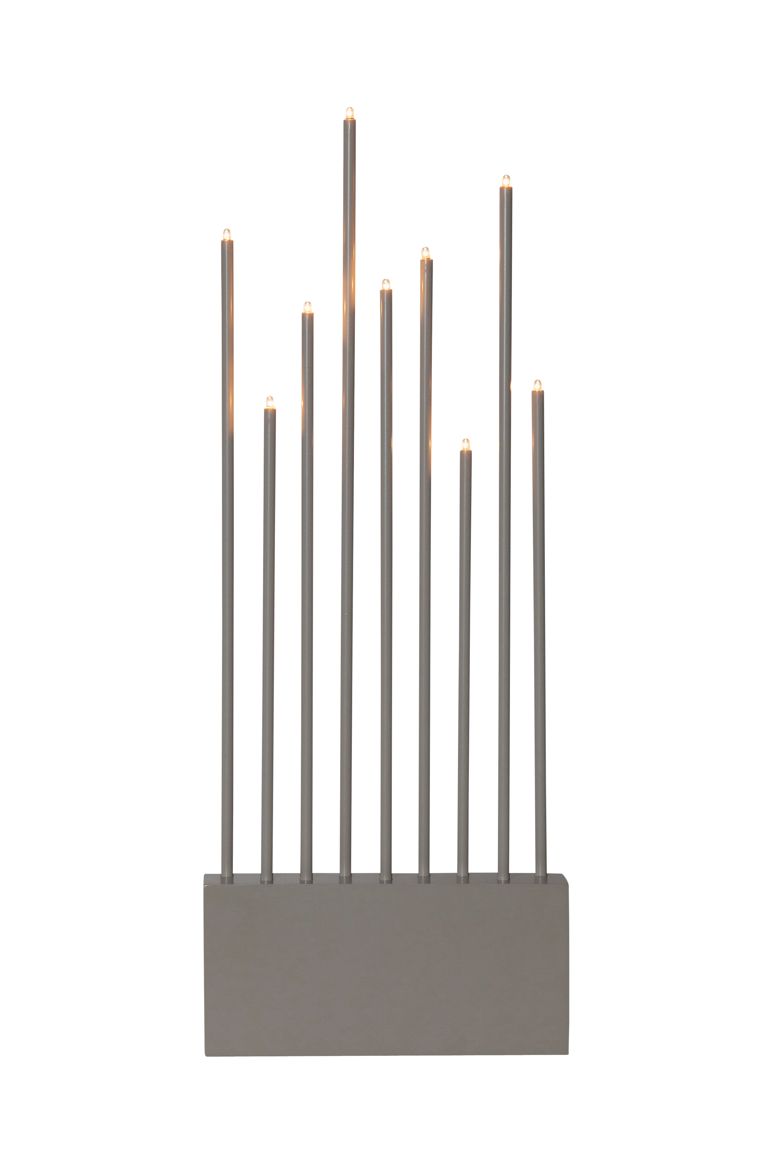 Stijlvolle kandelaar met robuuste houten voet en lampjes in smalle metalen buisjes. 9 lichtbronnen, incl. E5-lampen. De kandelaar is van grafiet. Gekleurd textielsnoer met schakelaar. Creëert het hele jaar door een fijn sfeerlicht. Spanning verlichting 12V. Spanning 12 V.