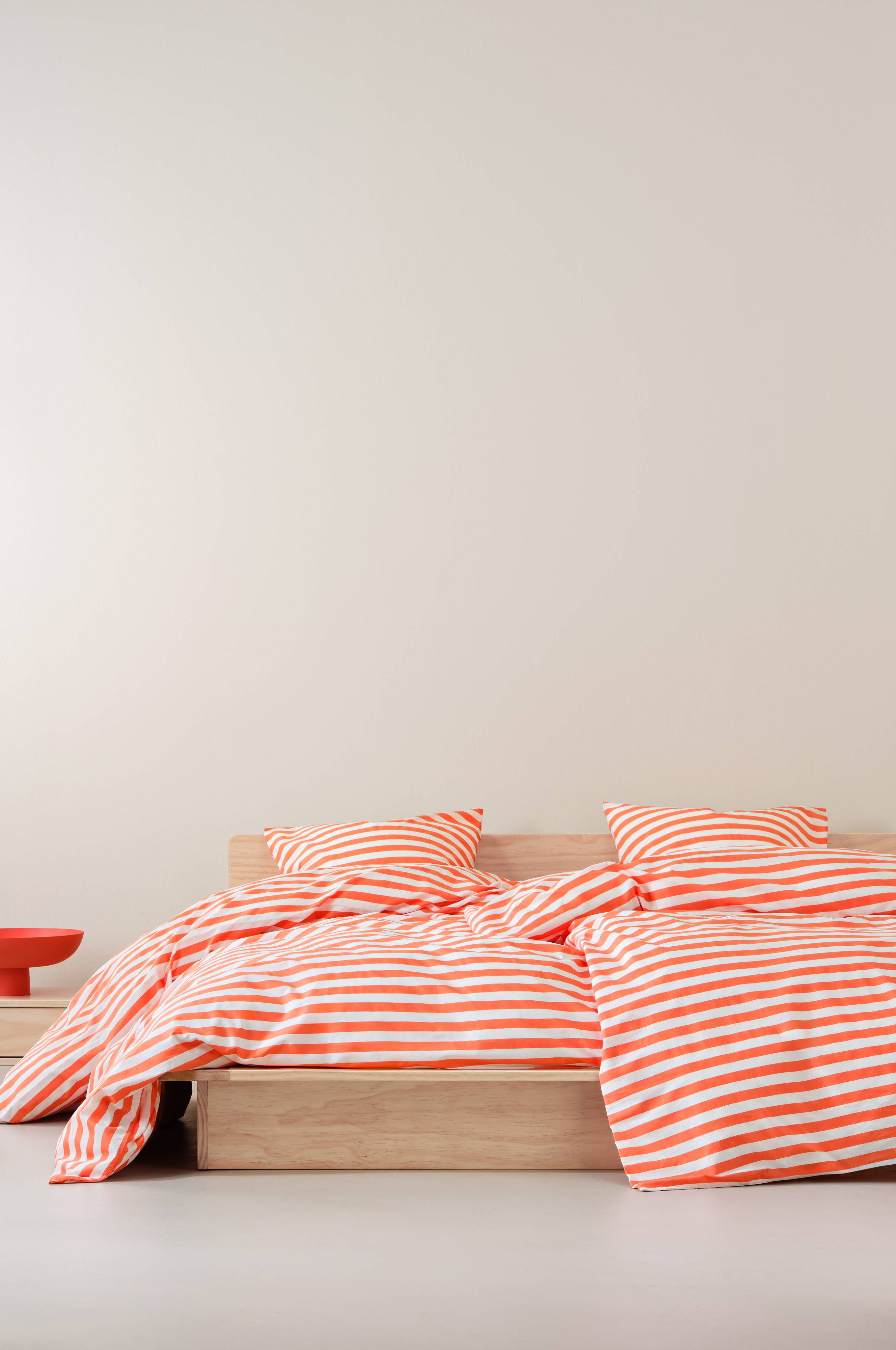 Een gestreept dekbedovertrek van katoen. Het horizontale streepdessin is aan beide zijden geprint in frisse, zomerse kleuren. Katoen is een zachte en aangename kwaliteit die koel aanvoelt op de huid. Draaddichtheid 144. (De draaddichtheid geeft het aantal draden aan per vierkante inch van een stof. Hoe hoger de draaddichtheid, hoe hoger de kwaliteit. Met uitzondering van linnen, dat voor het juiste resultaat vaak losser geweven wordt.)
