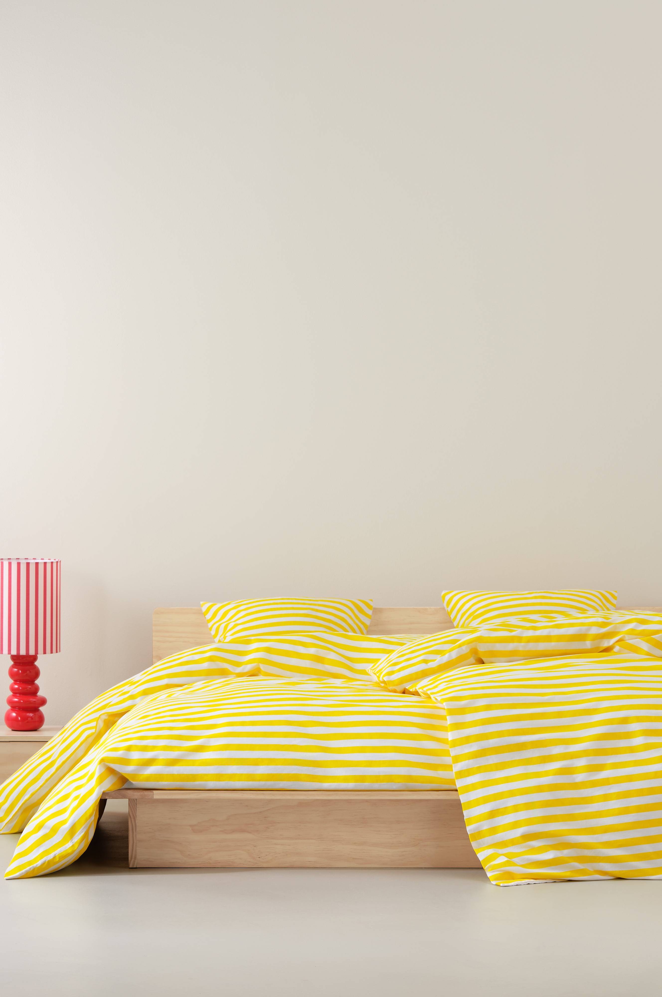 Een gestreept dekbedovertrek van katoen. Het horizontale streepdessin is aan beide zijden geprint in frisse, zomerse kleuren. Katoen is een zachte en aangename kwaliteit die koel aanvoelt op de huid. Draaddichtheid 144. (De draaddichtheid geeft het aantal draden aan per vierkante inch van een stof. Hoe hoger de draaddichtheid, hoe hoger de kwaliteit. Met uitzondering van linnen, dat voor het juiste resultaat vaak losser geweven wordt.)