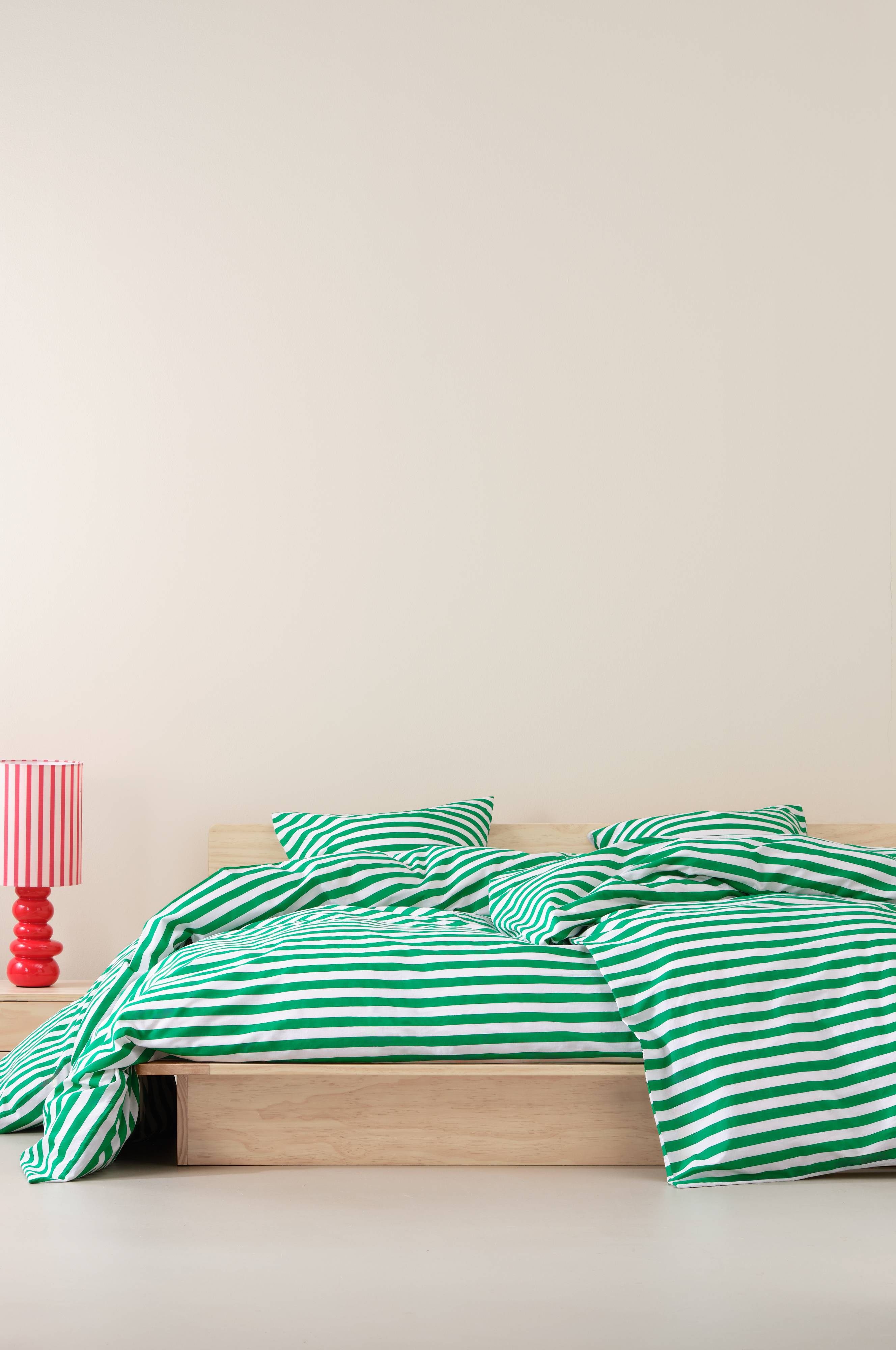 Een gestreept dekbedovertrek van katoen. Het horizontale streepdessin is aan beide zijden geprint in frisse, zomerse kleuren. Katoen is een zachte en aangename kwaliteit die koel aanvoelt op de huid. Draaddichtheid 144. (De draaddichtheid geeft het aantal draden aan per vierkante inch van een stof. Hoe hoger de draaddichtheid, hoe hoger de kwaliteit. Met uitzondering van linnen, dat voor het juiste resultaat vaak losser geweven wordt.)