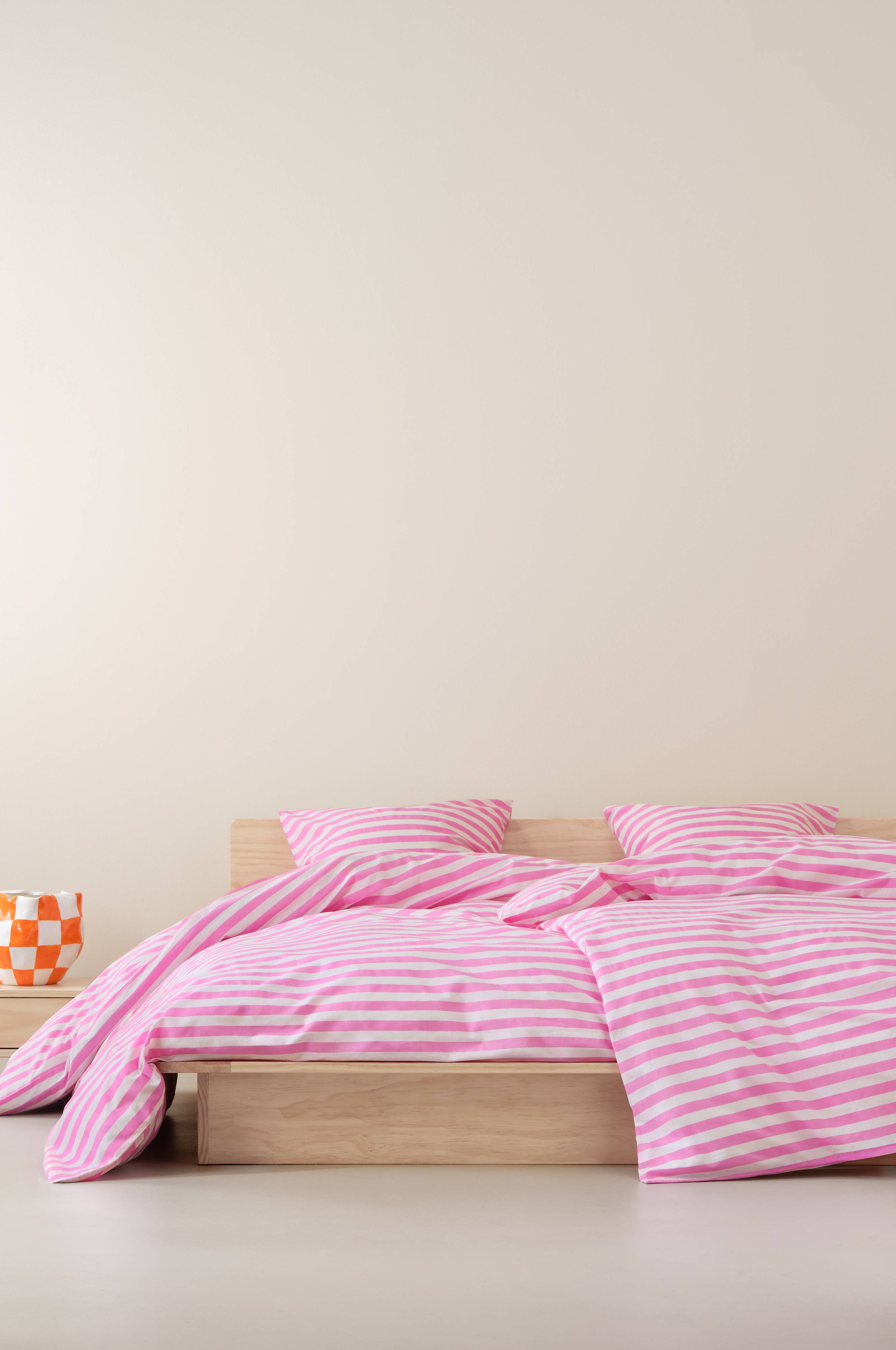 Een gestreept dekbedovertrek van katoen. Het horizontale streepdessin is aan beide zijden geprint in frisse, zomerse kleuren. Katoen is een zachte en aangename kwaliteit die koel aanvoelt op de huid. Draaddichtheid 144. (De draaddichtheid geeft het aantal draden aan per vierkante inch van een stof. Hoe hoger de draaddichtheid, hoe hoger de kwaliteit. Met uitzondering van linnen, dat voor het juiste resultaat vaak losser geweven wordt.)