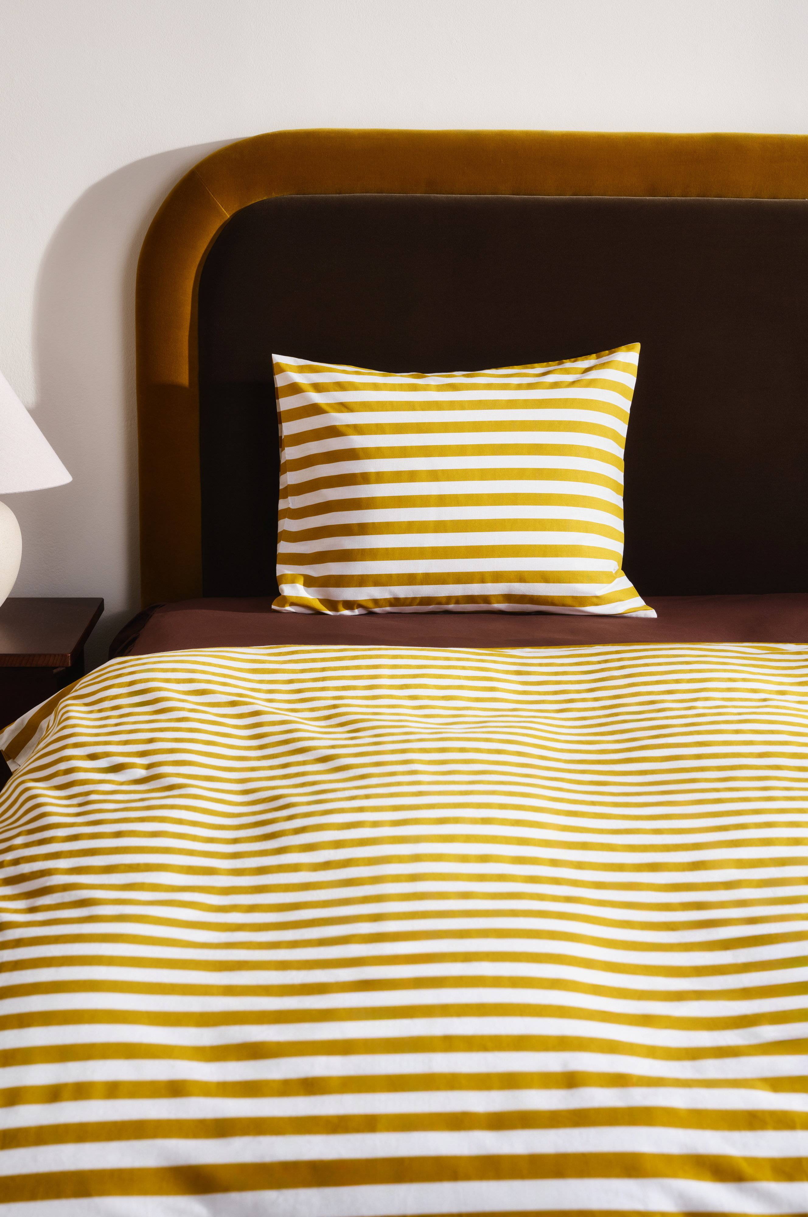 Een gestreept dekbedovertrek van katoen. Het horizontale streepdessin is aan beide zijden geprint in frisse, zomerse kleuren. Katoen is een zachte en aangename kwaliteit die koel aanvoelt op de huid. Draaddichtheid 144. (De draaddichtheid geeft het aantal draden aan per vierkante inch van een stof. Hoe hoger de draaddichtheid, hoe hoger de kwaliteit. Met uitzondering van linnen, dat voor het juiste resultaat vaak losser geweven wordt.)