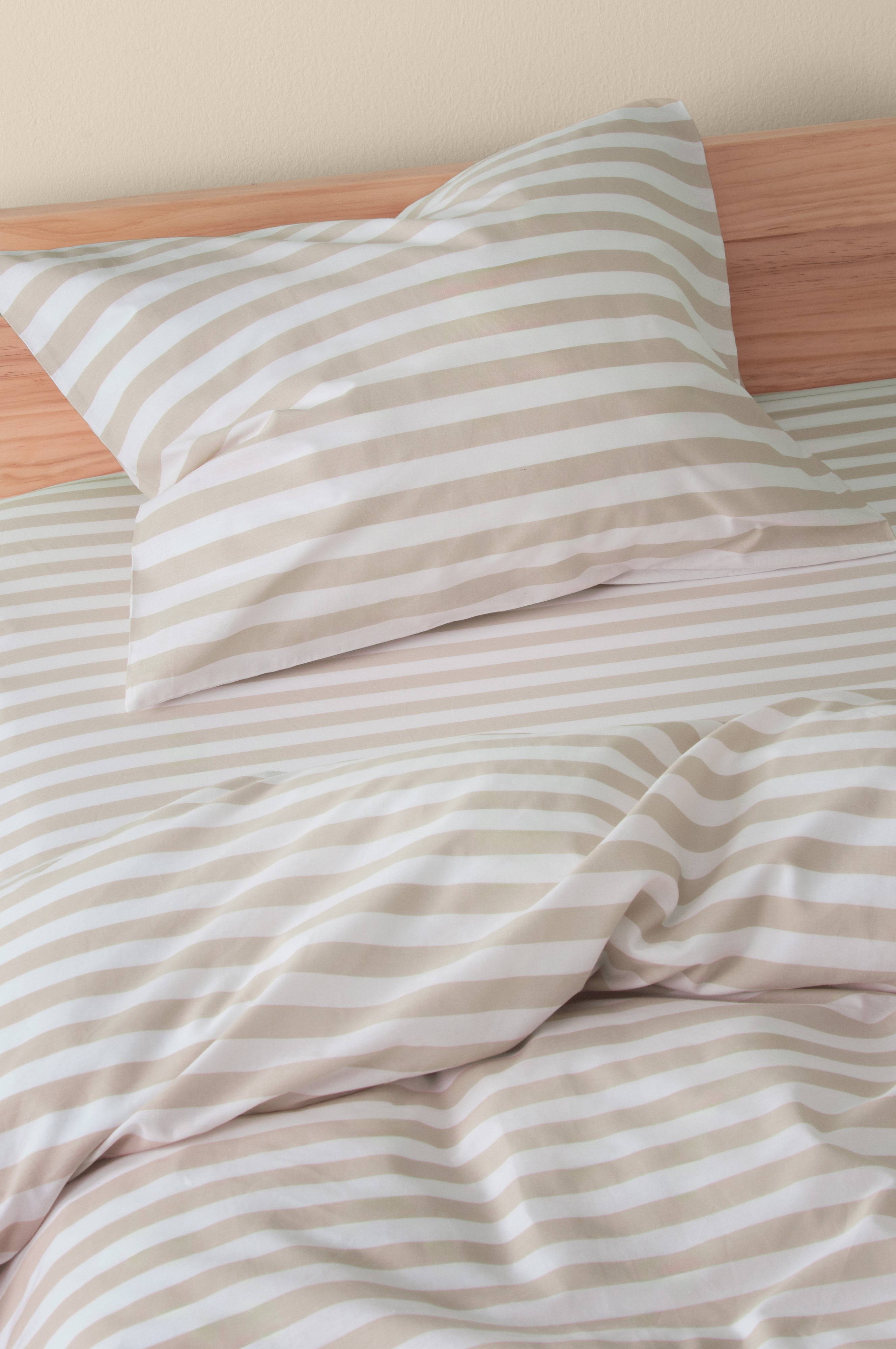 Een kussensloop van gestreept katoen. Het horizontale streepdessin is aan beide zijden van het kussensloop geprint in frisse, zomerse kleuren. Katoen is een zachte en aangename kwaliteit die koel aanvoelt op de huid. Draaddichtheid 144. (De draaddichtheid geeft het aantal draden aan per vierkante inch van een stof. Hoe hoger de draaddichtheid, hoe hoger de kwaliteit. Met uitzondering van linnen, dat voor het juiste resultaat vaak losser geweven wordt.)