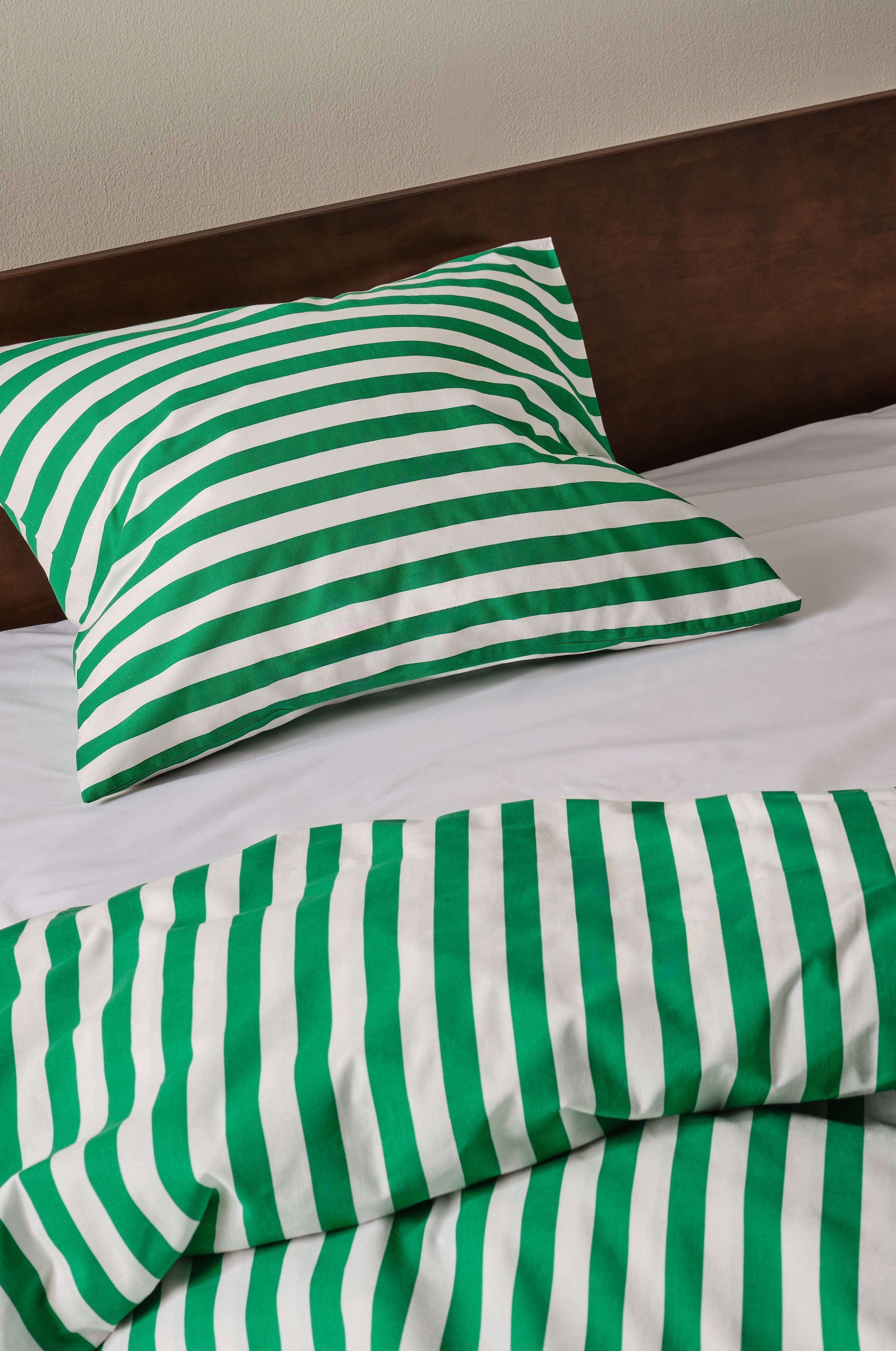 Een kussensloop van gestreept katoen. Het horizontale streepdessin is aan beide zijden van het kussensloop geprint in frisse, zomerse kleuren. Katoen is een zachte en aangename kwaliteit die koel aanvoelt op de huid. Draaddichtheid 144. (De draaddichtheid geeft het aantal draden aan per vierkante inch van een stof. Hoe hoger de draaddichtheid, hoe hoger de kwaliteit. Met uitzondering van linnen, dat voor het juiste resultaat vaak losser geweven wordt.)