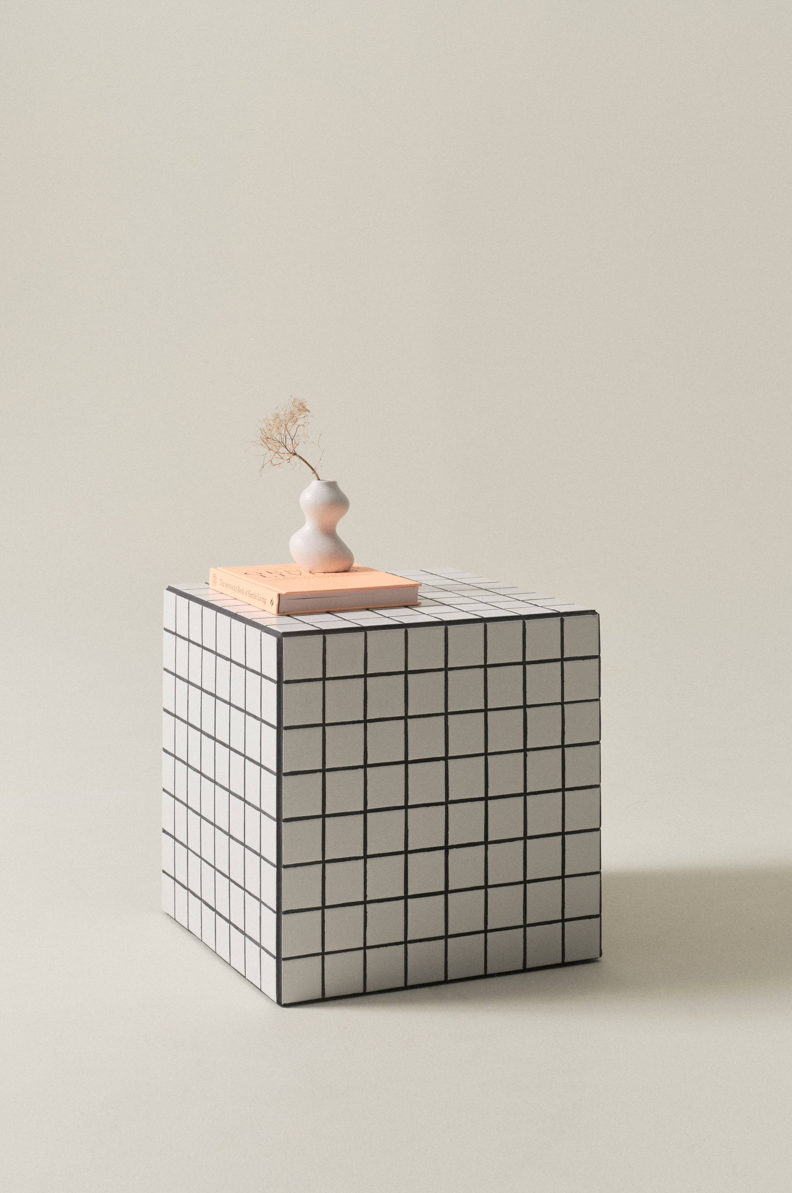 Een kubusvormige bijzettafel geheel bedekt met tegeltjes met matchende voegen. Het frame is van mdf. Deze bijzettafel is een veelzijdig meubelstuk dat je naast de bank kunt zetten of in een lichte hoek met planten erop. Wees creatief bij het inrichten. Een interieur samenstellen met kleinere meubels die eenvoudig verplaatst kunnen worden is altijd een feestje.