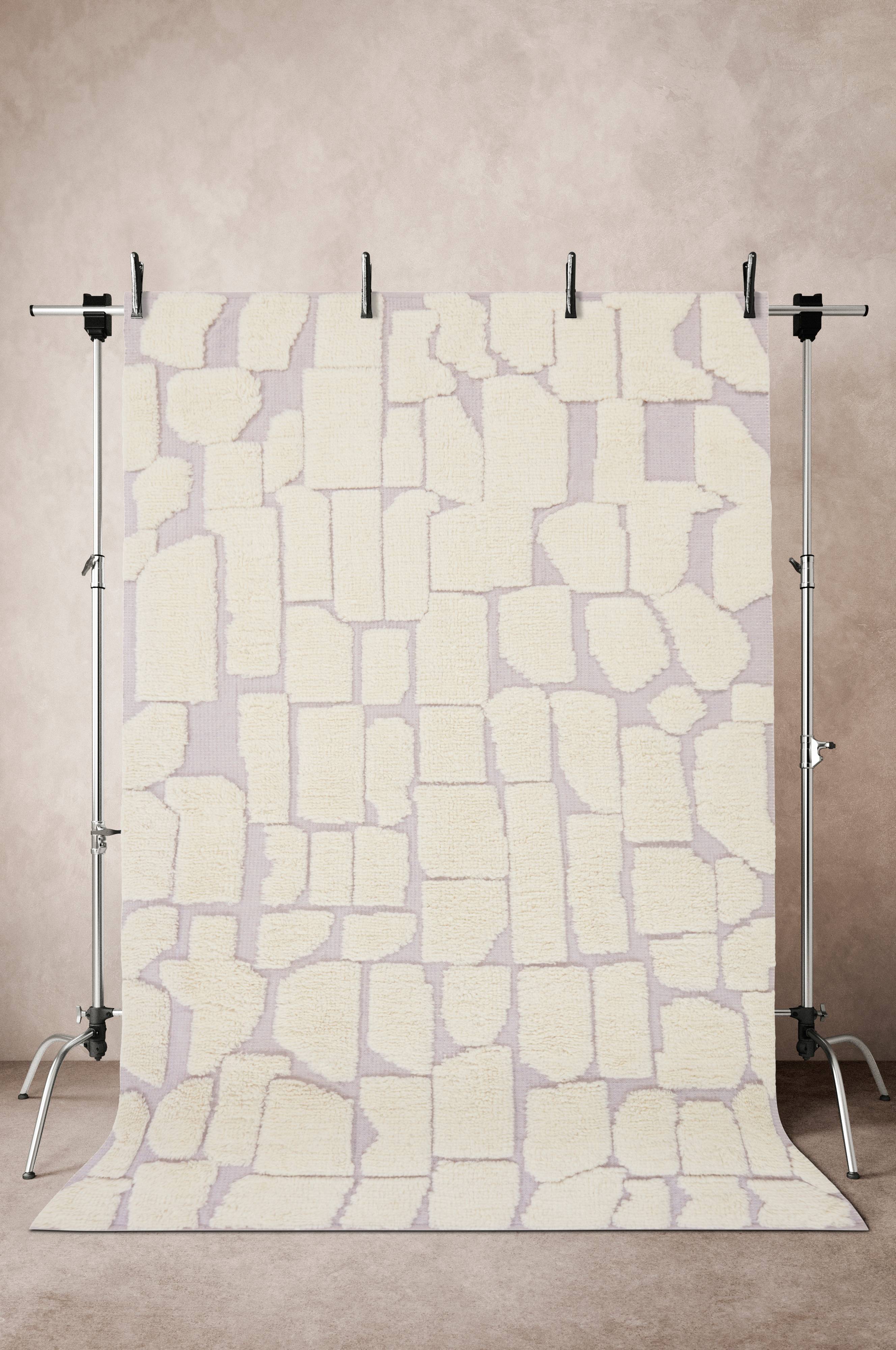 Een handgetuft vloerkleed van wol met accenten van katoen. Het dessin is gecreëerd met een lichte en zachte pool op een gekleurde geweven ondergrond. Door de wol is dit een natuurlijk warm, praktisch en vuilafstotend vloerkleed. Poolhoogte 1,8-2 cm. Dikte 2-2,2 cm. 1400-1600 g/m².