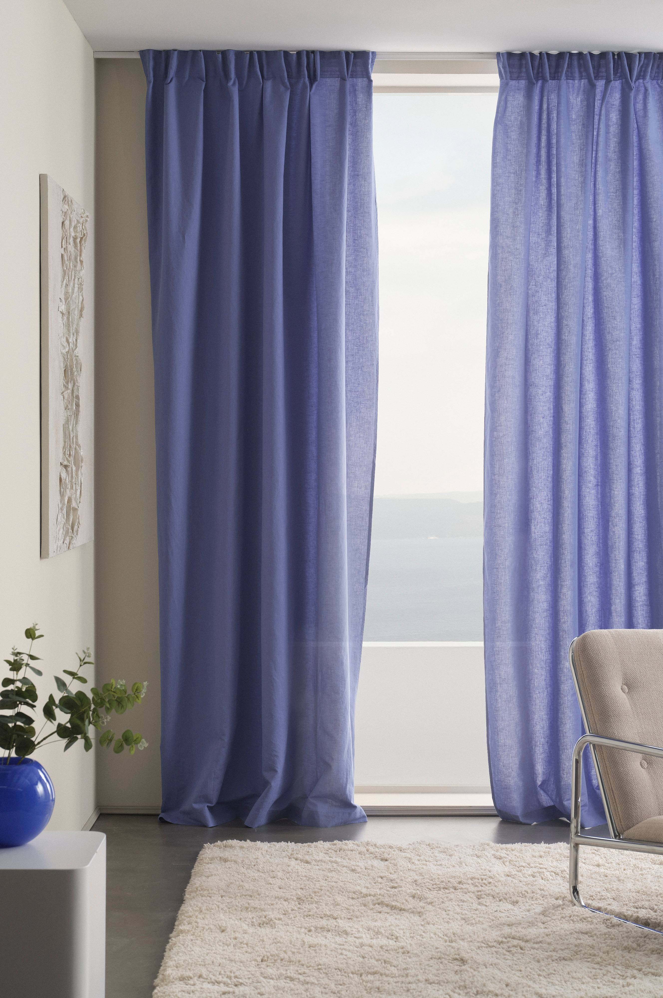 Twee gordijnlengtes in een fijne linnenmix waarbij het linnen gemengd is met katoen. De mix van katoen en linnen zorgt voor een onderhoudsvriendelijke kwaliteit met de voordelen van zowel katoen als linnen. Het linnen brengt de iets stevigere structuur en samen met het zachte katoen wordt de stof soepel en valt mooi. De lengtes hebben opgenaaide multifunctionele bandjes en kunnen worden opgehangen met vingerhaakjes of verborgen hangers. Eenkleurig is gemakkelijk te combineren en past net zo goed bij effen textiel in bijpassende kleuren als bij textiel met een patroon.