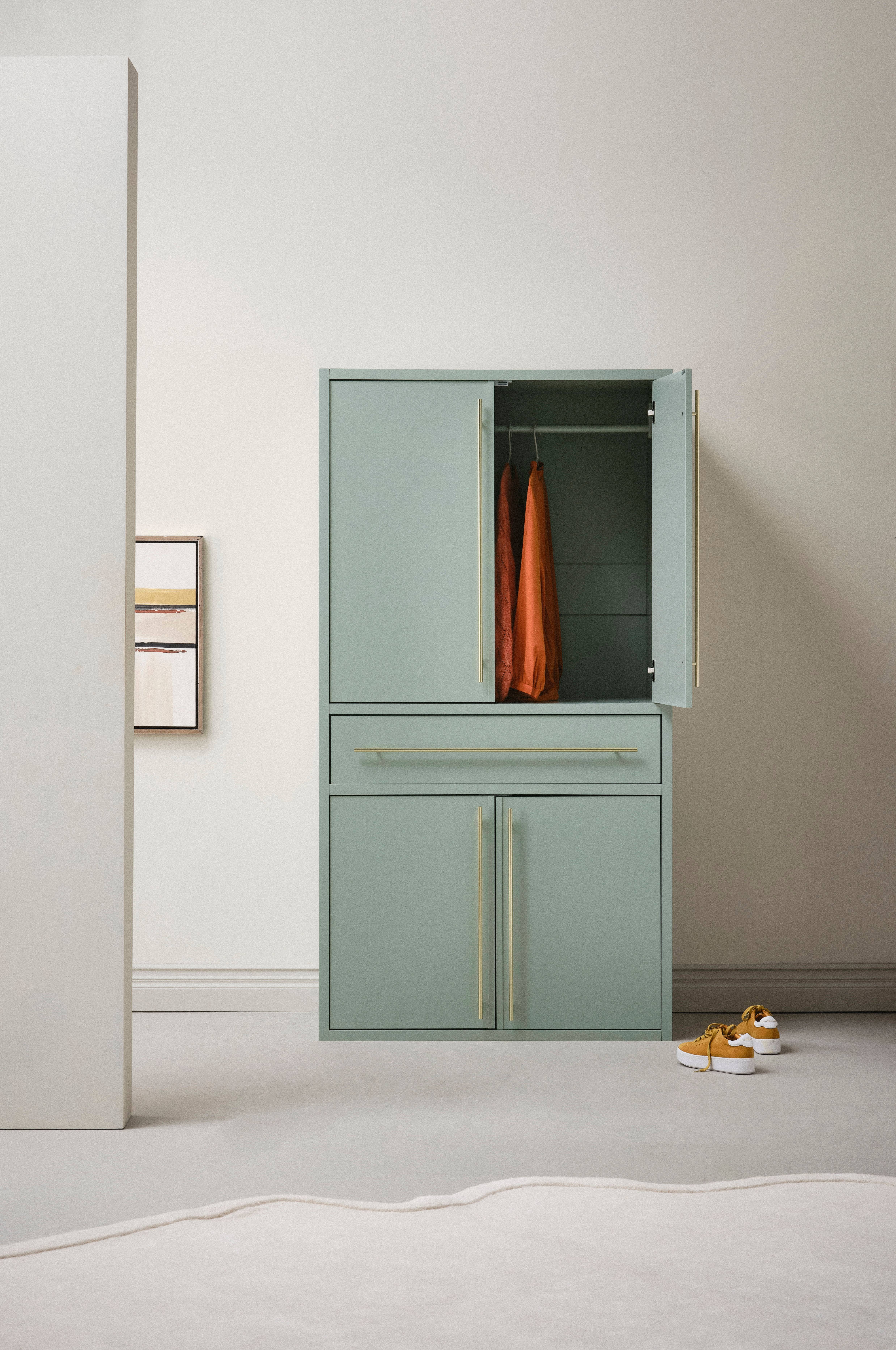 Een kledingkast van mdf die met verf op waterbasis is afgewerkt. De handgreep is van staal in een mooie bijpassende contrasterende kleur. Kledingkast KLÖVERDAL is praktisch ingericht met een kledingroede, lade en legplanken. De deuren hebben zacht sluitende scharnieren en stevige handgrepen. De kledingroede boven in de kast is van massief rubberhout. De twee legplanken in de kast zijn verplaatsbaar zodat je de indeling naar wens kunt aanpassen. De kledingkast staat direct op de vloer, zodat er geen stof onder verzameld wordt. De kast biedt plek voor alles van hangende overhemden tot ondergoed. Kleerhangers niet inbegrepen. Enige montage is vereist. Montage-instructies worden meegeleverd.