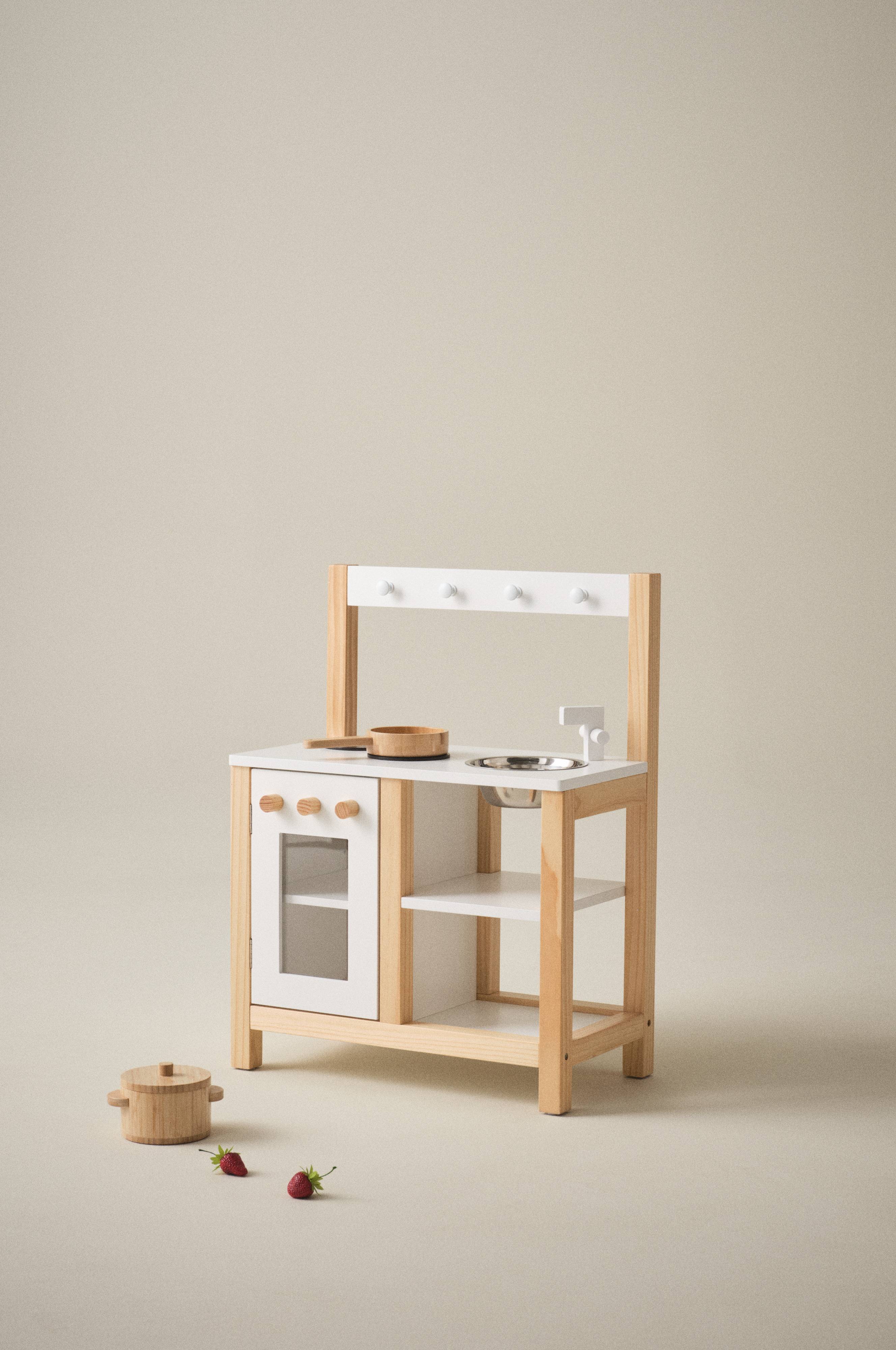 Een speelkeuken van gelakt grenenhout in combinatie met gelakt mdf. Dit fantastische keukentje heeft alles dat een kind zich wensen kan. Het heeft twee zwarte kookplaten en een uitneembare, roestvrij stalen wasbak met een houten kraantje. Boven zit een hakenrekje om spullen aan op te hangen. De oven heeft een deurtje met een kunststof venster en een plank aan de binnenkant. Onder de wasbak zijn twee legplanken verwerkt.
