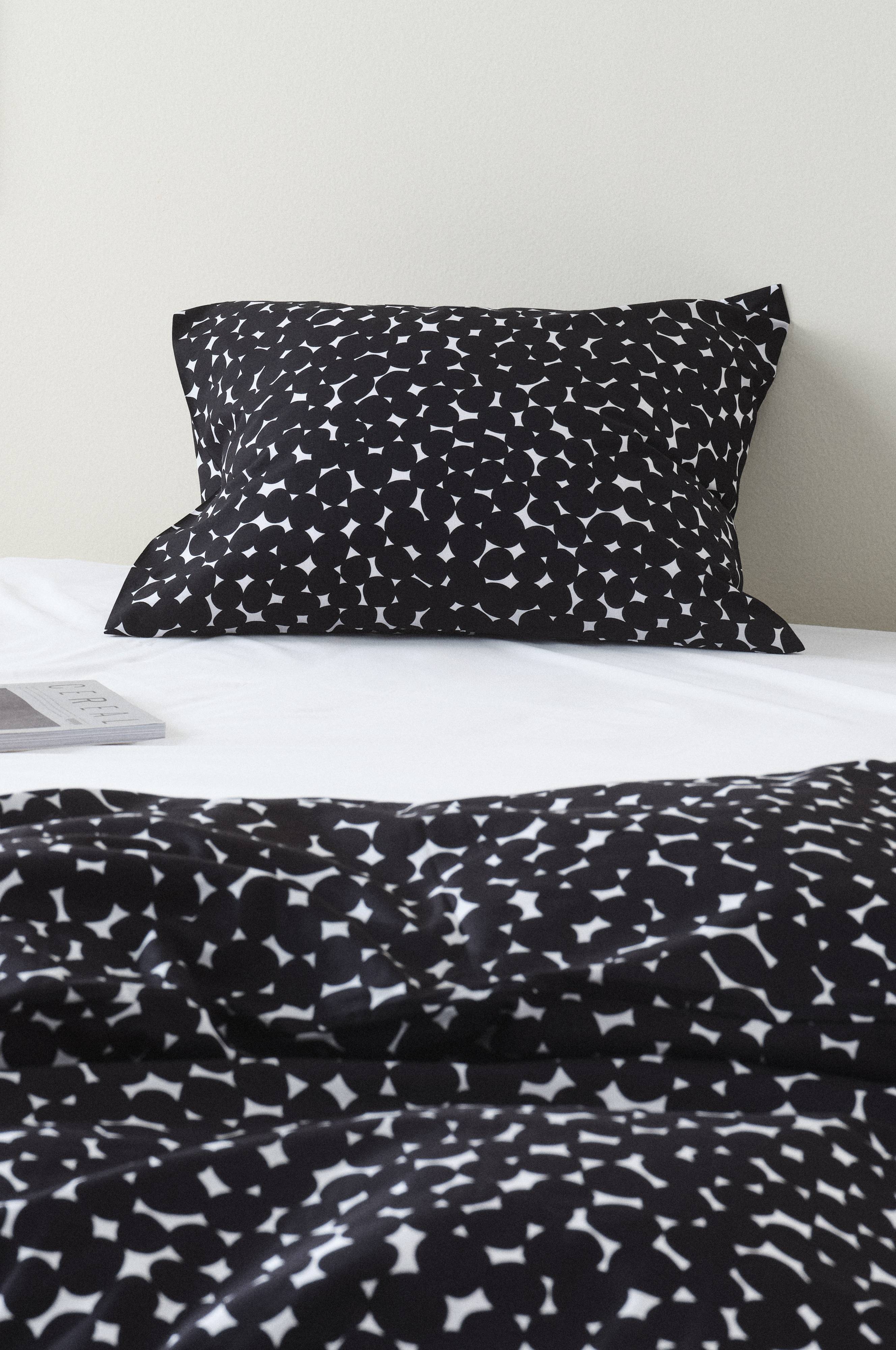 Een kussensloop van heerlijk katoen met een print van stippen die dicht op elkaar staan. Katoen is een koele, frisse kwaliteit die aangenaam aanvoelt. Draaddichtheid 144. (De draaddichtheid geeft het aantal draden aan per vierkante inch van een stof. Hoe hoger de draaddichtheid, hoe hoger de kwaliteit.)