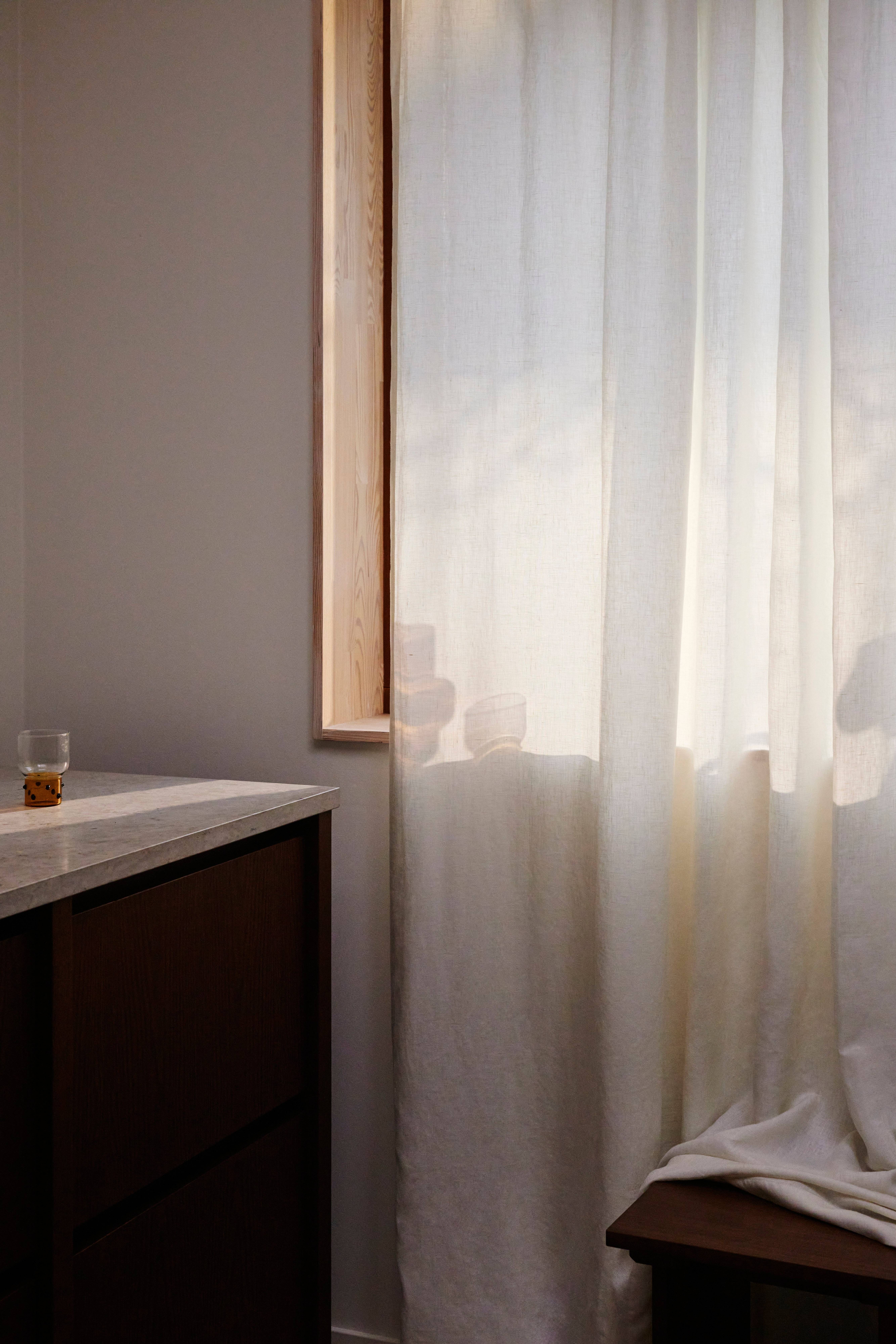 De gordijnen worden met de hand genaaid en gezoomd in onze studio in Borås. Om een mooie valling en exclusief gevoel in het gordijn te krijgen, naaien we kleine zakken voor gewichten aan de onderkant en is de zoom ook extra breed. Omdat elk gordijn uniek voor jou wordt gezoomd, kunnen deze gordijnen een langere levertijd hebben.