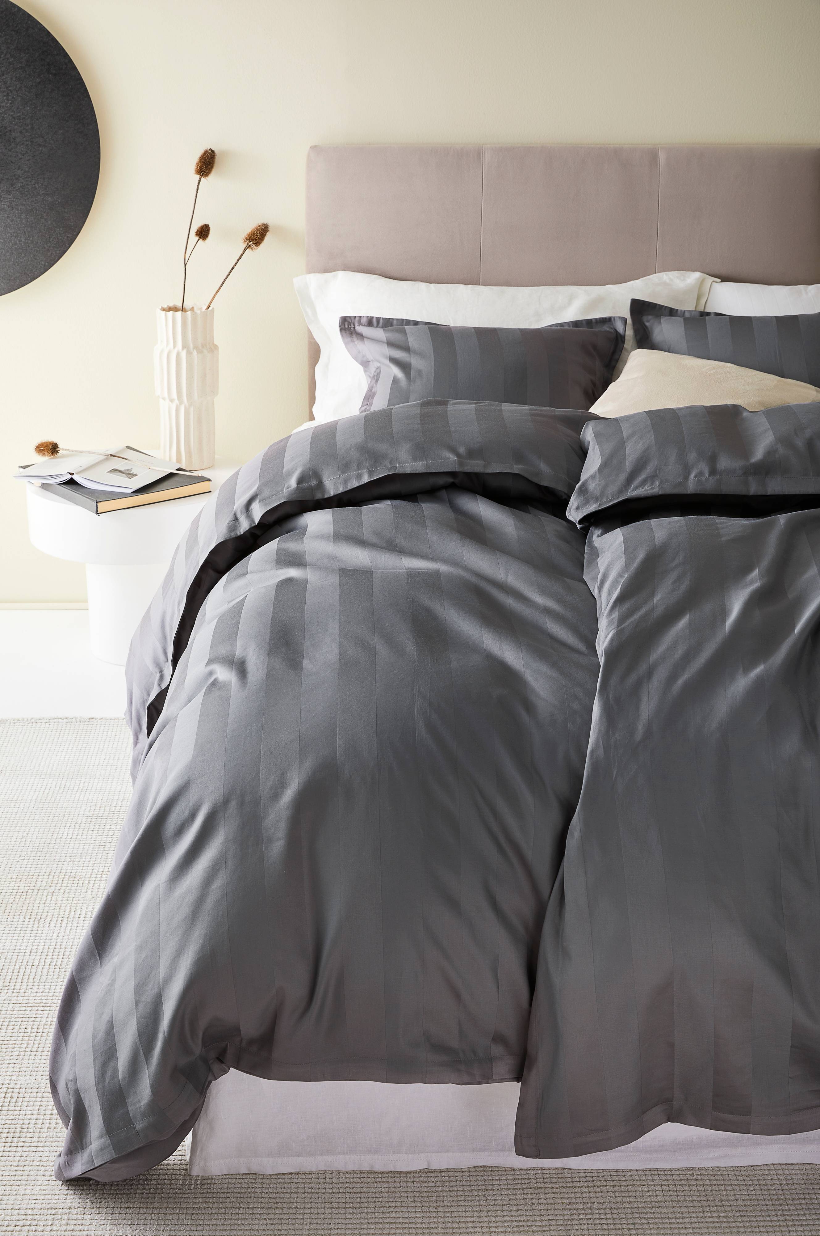 Een dekbedovertrek van biologisch katoenen satijn. Satijn is een weeftechniek met een fantastisch glad en zacht resultaat. Wanneer katoen op deze manier geweven wordt, krijgt de stof een prachtige glans en een luxe uitstraling. LEONA is een effen dekbedovertrek met ingeweven ton sur ton strepen. Draaddichtheid 300. (De draaddichtheid geeft het aantal draden aan per vierkante inch van een stof. Hoe hoger de draaddichtheid, hoe hoger de kwaliteit).