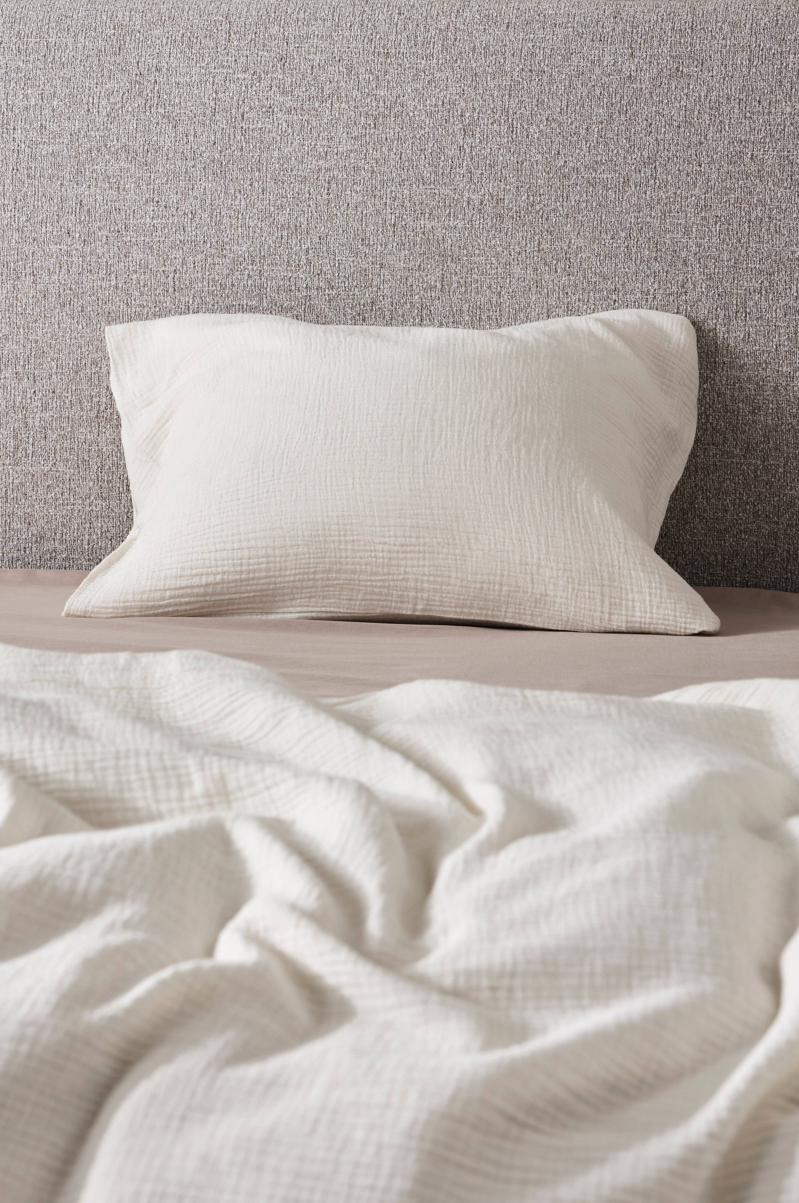 Een kussensloop van zacht katoenen mousseline. Mousseline is een zacht materiaal met een bobbelig effect, wat de stof zacht en extra onderhoudsvriendelijk maakt. Je hoeft niet te strijken of te mangelen. Het heerlijke mousseline materiaal is fijn om op te slapen. Draaddichtheid 178. (De draaddichtheid geeft het aantal draden aan per vierkante inch van een stof. Hoe hoger de draaddichtheid, hoe hoger de kwaliteit.)
