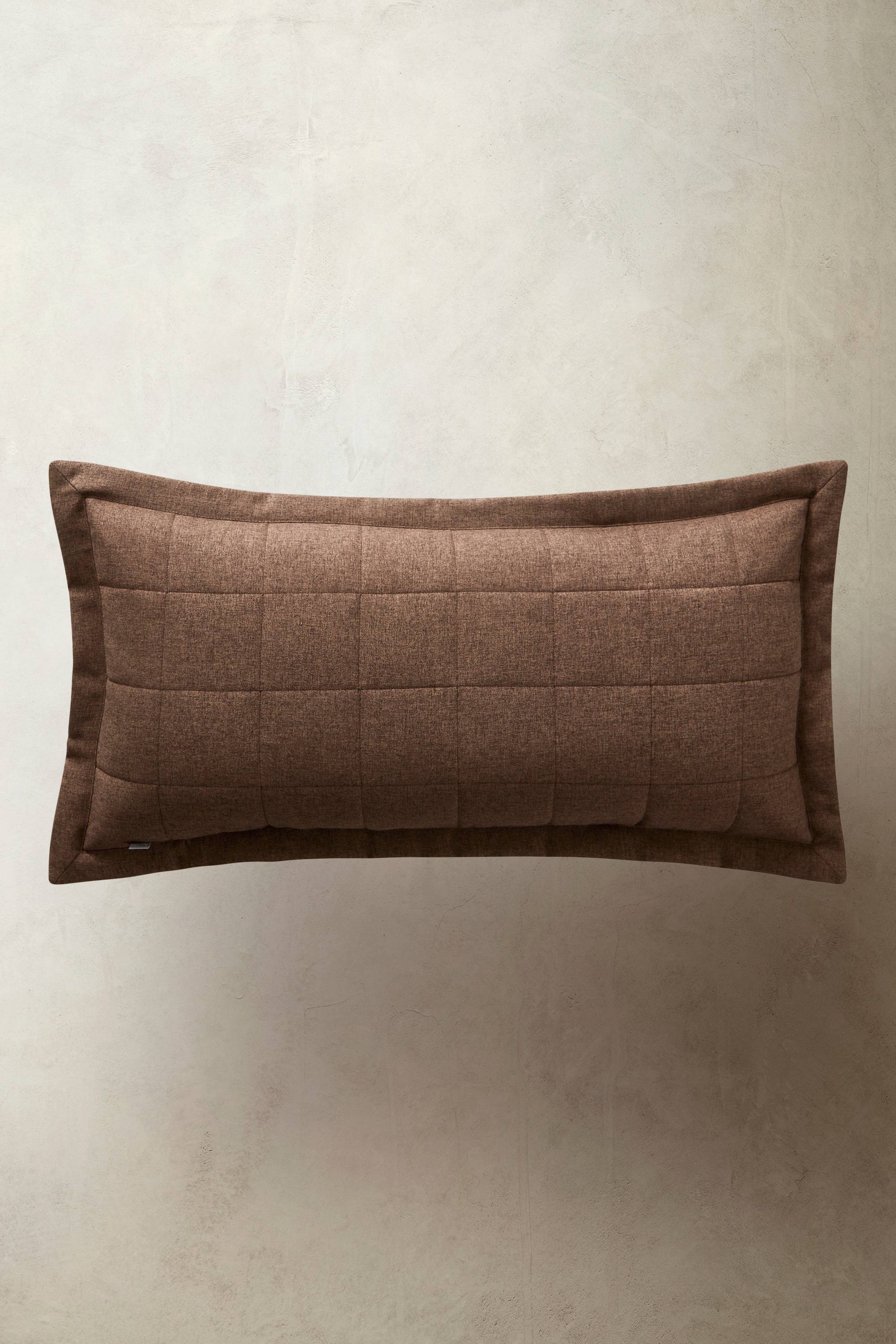 Een kussenhoes van polyester met een fijne textuur die als linnen aanvoelt. De kussenhoes is doorgestikt aan de voorkant. Ritssluiting aan de onderkant.