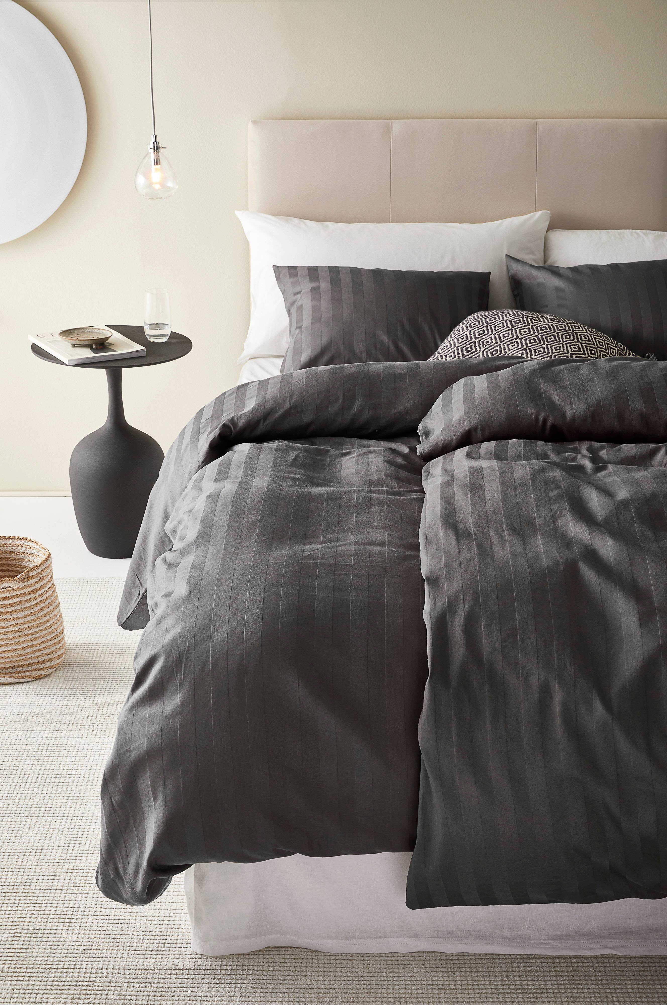 Een dekbedovertrek van effen katoenen satijn met ingeweven ton sur ton strepen. Satijn is een weeftechniek met een fantastisch glad en zacht resultaat. Wanneer katoen op deze manier geweven wordt, krijgt de stof een prachtige glans en een luxe uitstraling. Draaddichtheid 215. (De draaddichtheid geeft het aantal draden aan per vierkante inch van een stof. Hoe hoger de draaddichtheid, hoe hoger de kwaliteit). Opening in de bovenhoeken van de dekbedovertrek.