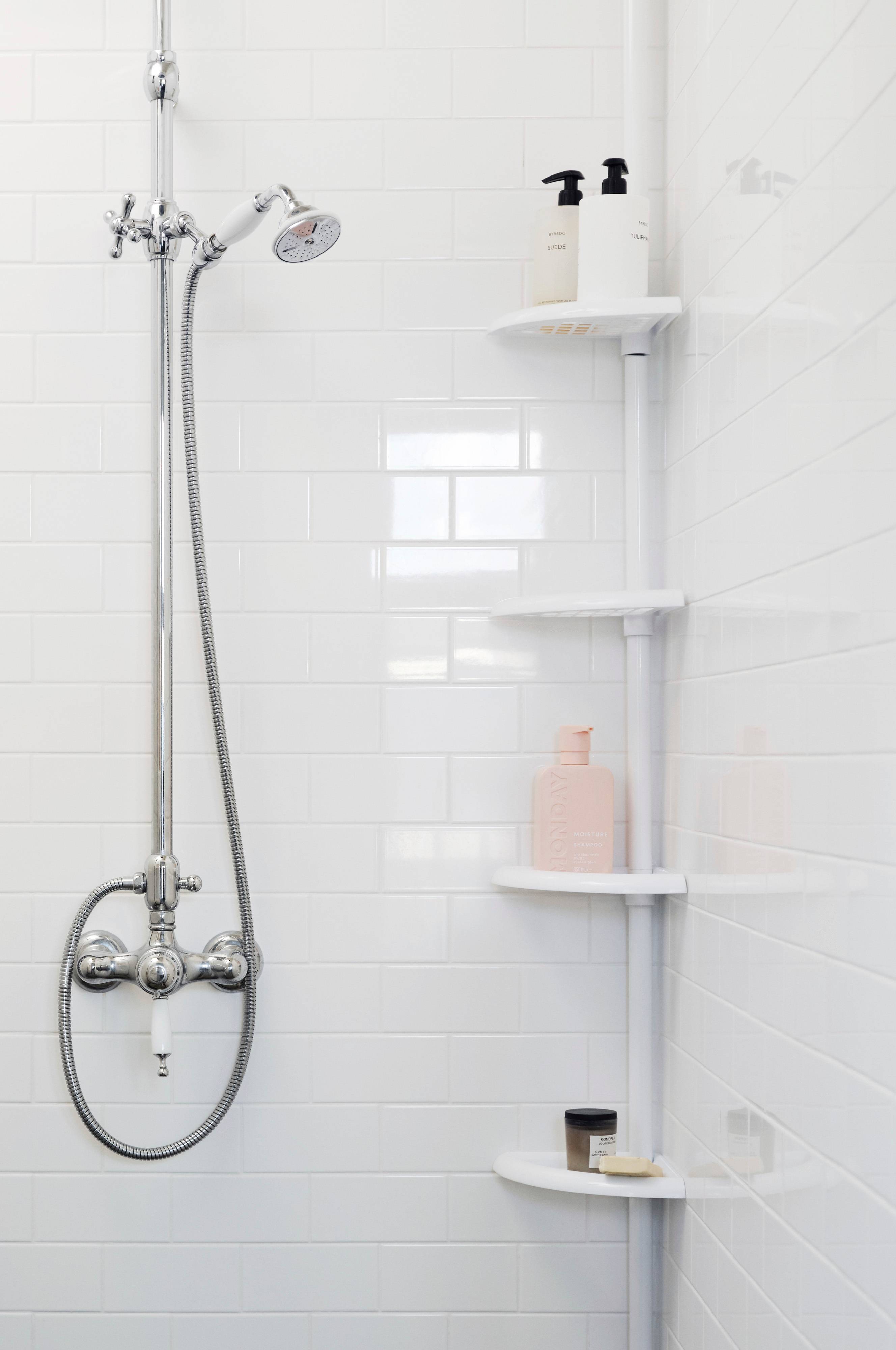 Een hoekwandrekje van kunststof met een metalen telescoopstang. Een praktisch hoekrekje met vier verplaatsbare plankjes dat perfect in de badkamer past. Plaats het rekje tussen de rand van het bad en het plafond of tussen de vloer en het plafond. Door de telescoopstang is het rekje in hoogte verstelbaar en kan het eenvoudig bevestigd worden. Met de vier verplaatsbare plankjes kun je het rekje aan jouw wensen aanpassen.