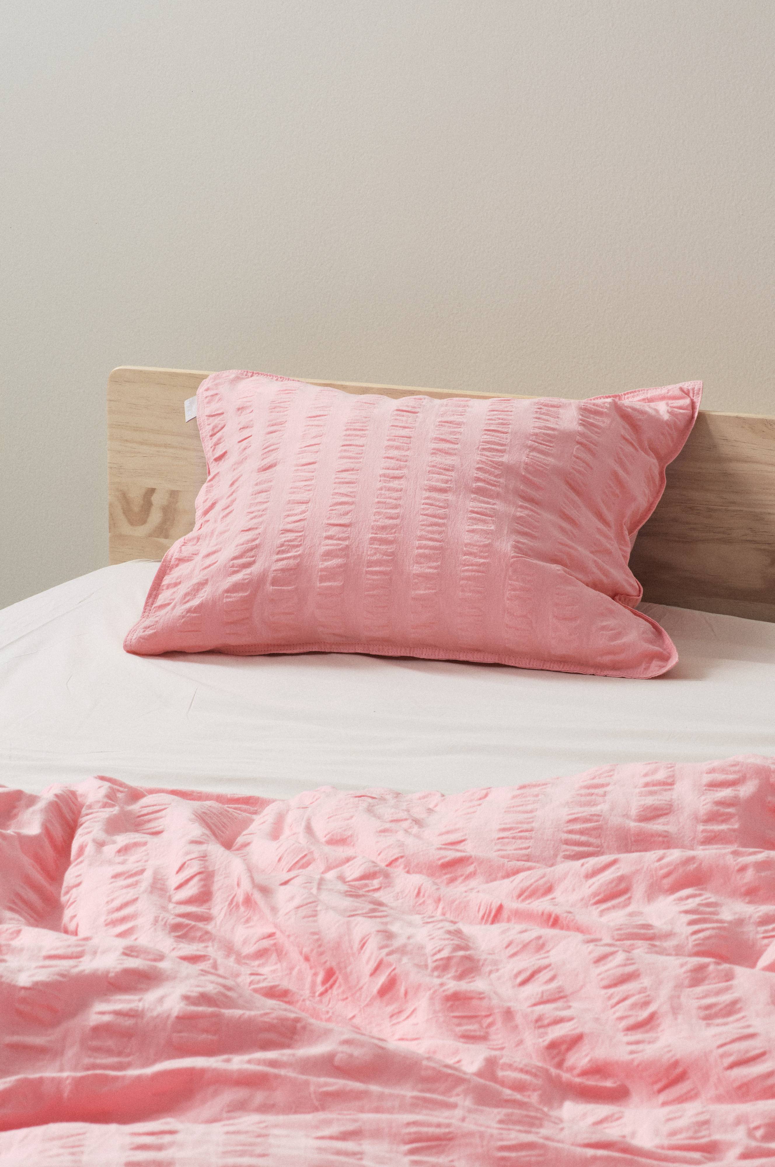 Een kussensloop van zacht seersucker van gecertificeerd, biologisch katoen. Seersucker is een luchtige, ademende kwaliteit met een bobbelige structuur die koel aanvoelt. De serie LOLO is effen en tegelijkertijd gestreept, gladgeweven stof wordt afgewisseld met strepen van seersucker. De stof is vooraf geverfd en gewassen waardoor deze zachter en soepeler aanvoelt. Draaddichtheid 120. (De draaddichtheid geeft het aantal draden aan per vierkante inch van een stof. Hoe hoger de draaddichtheid, hoe hoger de kwaliteit.)